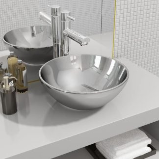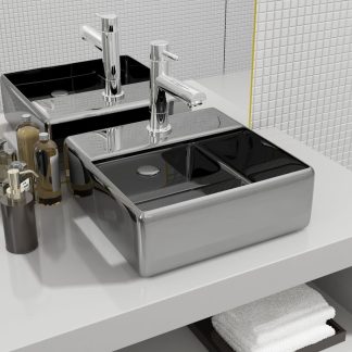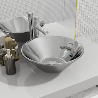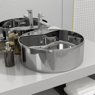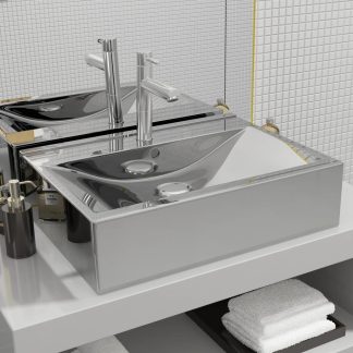 Lavatório com extravasamento 46,5×15,5 cm cerâmica prateado – PORTES GRÁTIS