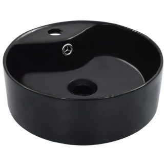 Lavatório cerâmica c/ orifícios para torneira/transbordo redondo preto – PORTES GRÁTIS