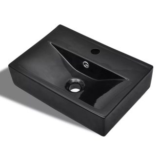 Lavatório cerâmica retangular de luxo + transbordo e torneira, preto – PORTES GRÁTIS