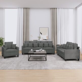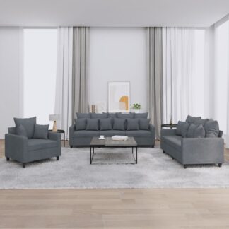 3 pcs conjunto de sofás com almofadas tecido cinzento-escuro – PORTES GRÁTIS