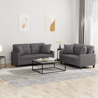 2 pcs conjunto de sofás com almofadas couro artificial cinzento – PORTES GRÁTIS