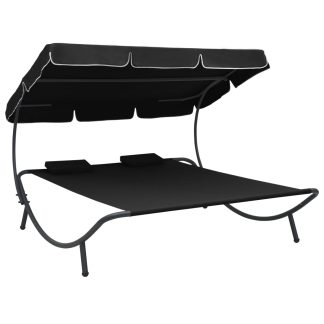 Espreguiçadeira com toldo e almofadas preto – PORTES GRÁTIS