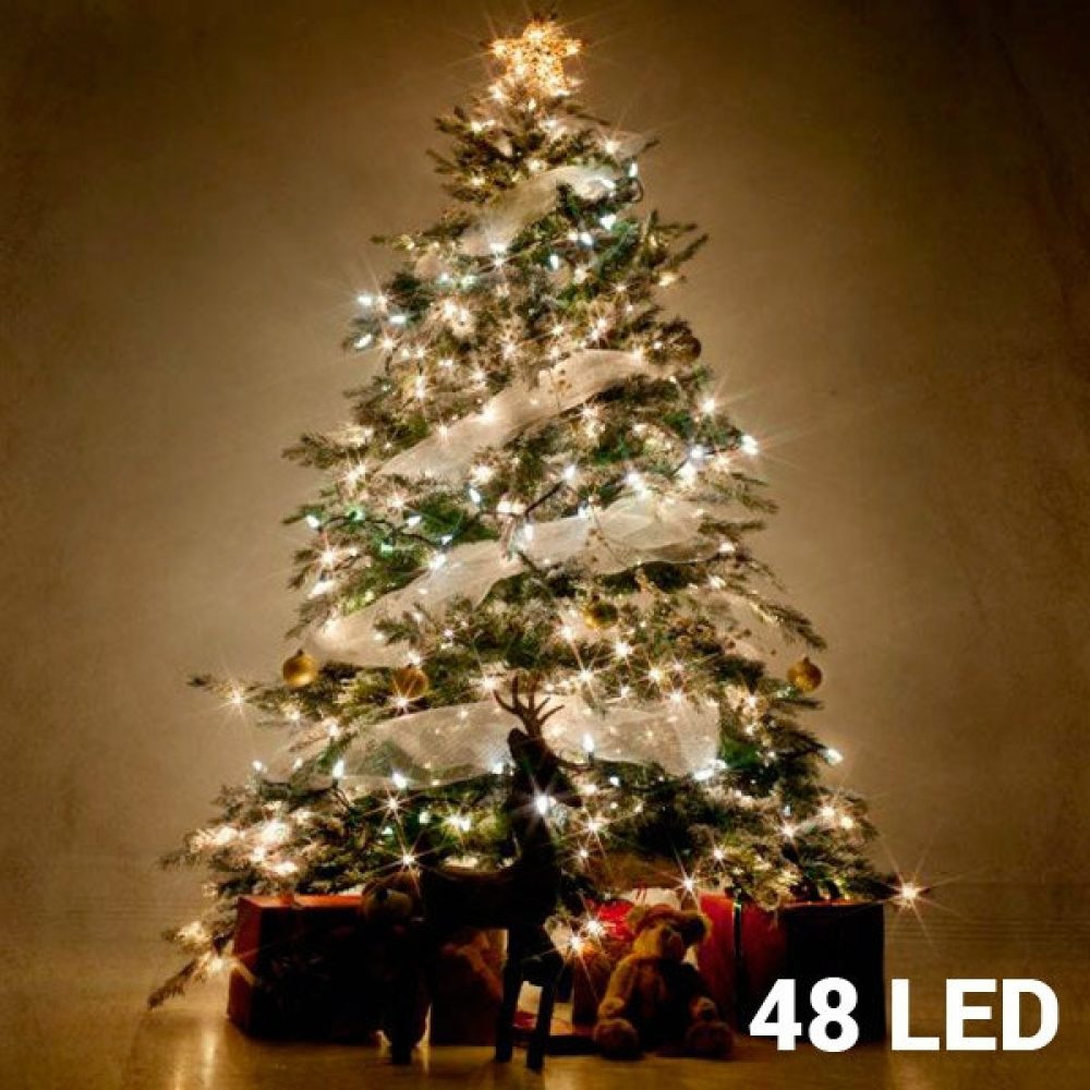 48 luzes Led de Natal brancas .Com 8 opções de luz (iluminação permanente, intermitente, com diversas intensidades…). Ideais para decorar presépios, árvores de Natal, terraços, varandas, etc. Apropriadas para interiores e exteriores. Funcionam a pilhas (3 x AA, não incluídas). Comprimento aprox.: 4,10 m.