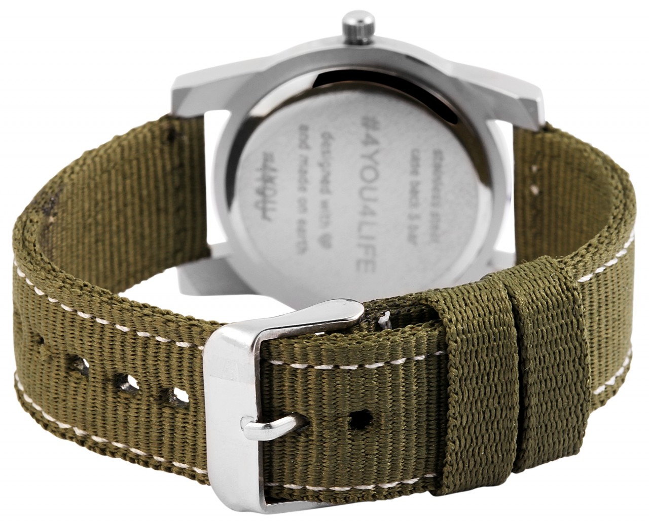 O relógio de pulso feminino da marca 4You possui um movimento de quartzo de alta qualidade que pode ser facilmente ajustado com uma coroa. A pulseira em tecido verde tem uma largura de 18 mm e pode ser aberta e fechada com uma fivela de aço inoxidável. O comprimento total do relógio feminino é de 22 cm. A caixa com vidro mineral tem diâmetro de 35 mm e altura de 9 mm. O relógio tem resistência à água de 5 bar e tampa da caixa em aço inoxidável. Este relógio de pulso feminino é versátil e pode ser usado idealmente na vida cotidiana, mas também em outras ocasiões e também chama a atenção no pulso.