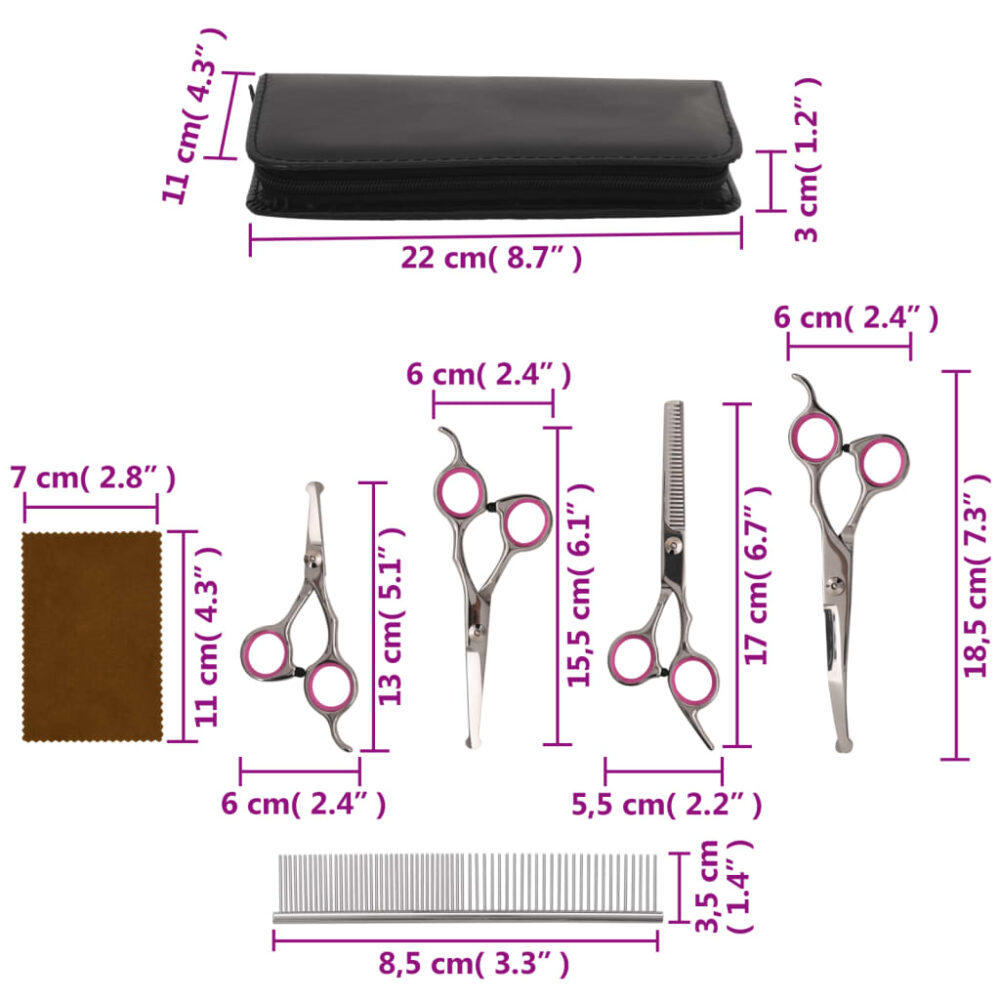 Torne-se um esteticista profissional para os seus animais de estimação em casa com este conjunto de tesouras de tosquia para cães! Material durável: as tesouras de tosquia para cães são feitas de aço inoxidável e são por isso afiadas, duráveis e resistentes à corrosão e à ferrugem.Parafusos ajustáveis: com os parafusos da tesoura, pode ajustar o aperto da mesma de acordo com as suas necessidades.Design ergonómico: todas as tesoura de tosquia para animais de estimação possuem pontas redondas para proteger os seus animais de companhia ao aparar áreas sensíveis, tais como o rosto, as orelhas, os olhos, o nariz e as patas. A almofada de borracha na pega impede que a tesoura escorregue das suas mãos e os apoios para os dedos foram concebidos para o máximo conforto.Utilização ampla: o conjunto profissional de tosquia para animais de estimação pode ser utilizado em qualquer animal de companhia peludo, tal como num cão teddy, pastor alemão ou akita ou num gato. Pode ser também usada em quaisquer partes sensíveis dos seus animais, tais como nos pelos dos ouvidos, no rosto e nas axilas.