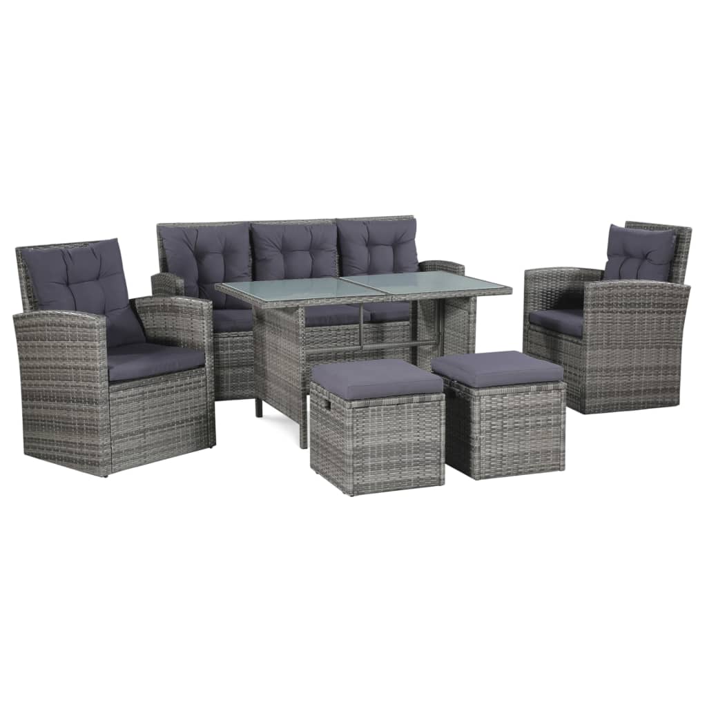 6 pcs conjunto lounge de jardim c/ almofadões vime PE cinzento - PORTES GRÁTIS