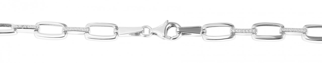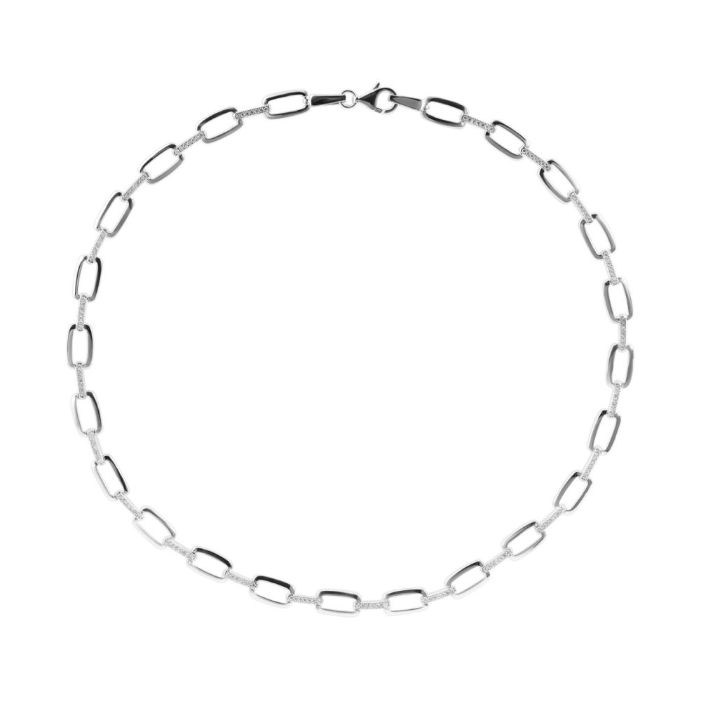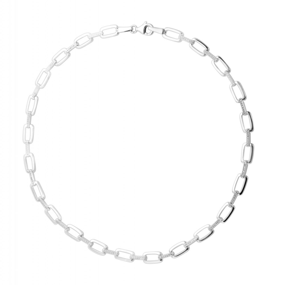 A corrente feita em prata esterlina 925. Tem comprimento de 45 cm, largura de 7 mm e espessura de 2 mm. É aberta e fechada com um mosquetão clássico e presa ao pescoço. Toda a cadeia de joias é banhada a ródio. Isso significa que ela é coberta por uma camada de metal precioso de alta qualidade que protege a joia de manchas. Além disso, o ródio realça o tom prateado e confere brilho perfeito. A característica especial do colar de prata é o formato especial dos elementos individuais. São compostos por elementos decorativos retangulares com cantos arredondados e fluem harmoniosamente entre si. Além disso, os fios entre os elos individuais da corrente são incrustados com pedras brilhantes de zircónia. O design brilhante e as pedras radiantes realçam habilmente o visual deste colar.