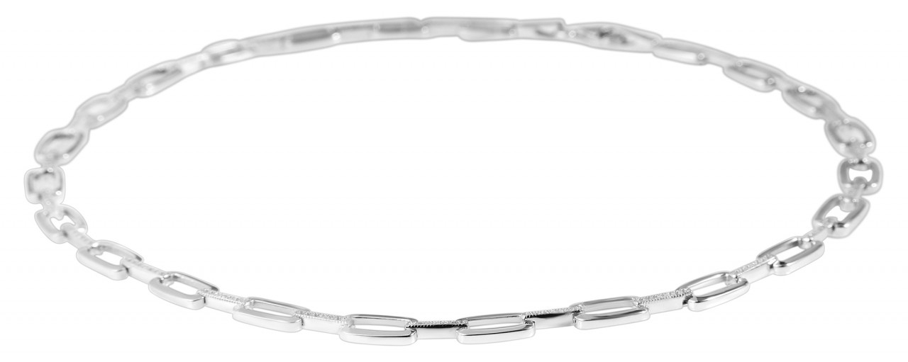 A corrente feita em prata esterlina 925. Tem comprimento de 45 cm, largura de 7 mm e espessura de 2 mm. É aberta e fechada com um mosquetão clássico e presa ao pescoço. Toda a cadeia de joias é banhada a ródio. Isso significa que ela é coberta por uma camada de metal precioso de alta qualidade que protege a joia de manchas. Além disso, o ródio realça o tom prateado e confere brilho perfeito. A característica especial do colar de prata é o formato especial dos elementos individuais. São compostos por elementos decorativos retangulares com cantos arredondados e fluem harmoniosamente entre si. Além disso, os fios entre os elos individuais da corrente são…