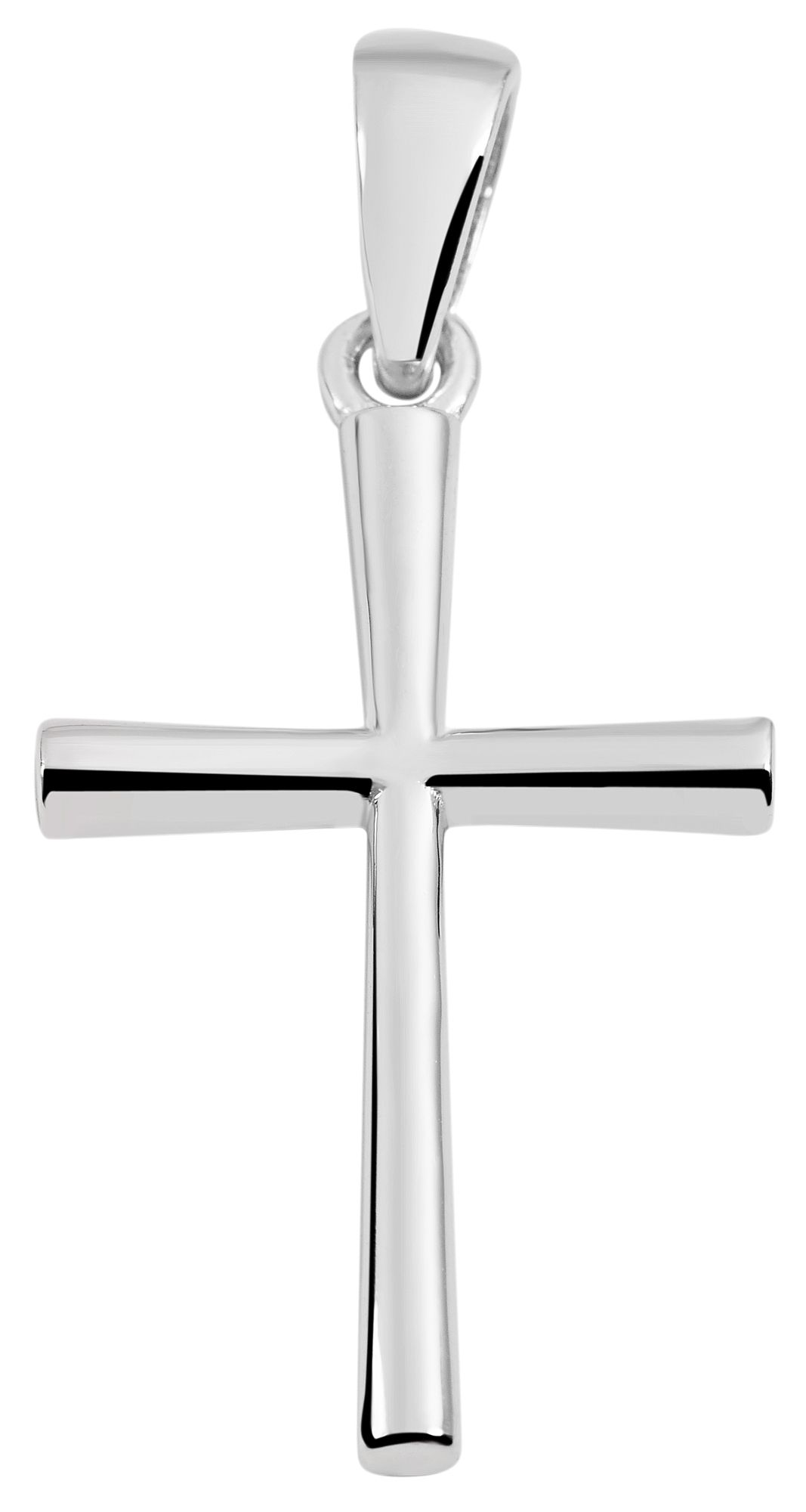 O pendente simples em forma de cruz foi fabricado em prata de lei 925 e é adicionalmente banhado a ródio. Desta forma, o material não oxida e a superfície brilha com um esplendor fantástico. Graças ao olhal oval, a cruz com a sua forma semicircular pode ser fixada em qualquer corrente adequada. O tamanho do pendente em forma de cruz é de 25 mm de comprimento, 15 mm de largura e 2 mm de espessura.