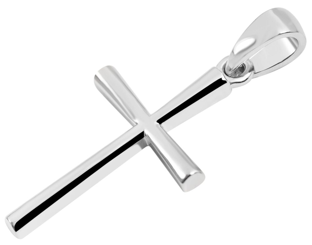 O pendente simples em forma de cruz foi fabricado em prata de lei 925 e é adicionalmente banhado a ródio. Desta forma, o material não oxida e a superfície brilha com um esplendor fantástico. Graças ao olhal oval, a cruz com a sua forma semicircular pode ser fixada em qualquer corrente adequada. O tamanho do pendente em forma de cruz é de 25 mm de comprimento, 15 mm de largura e 2 mm de espessura.