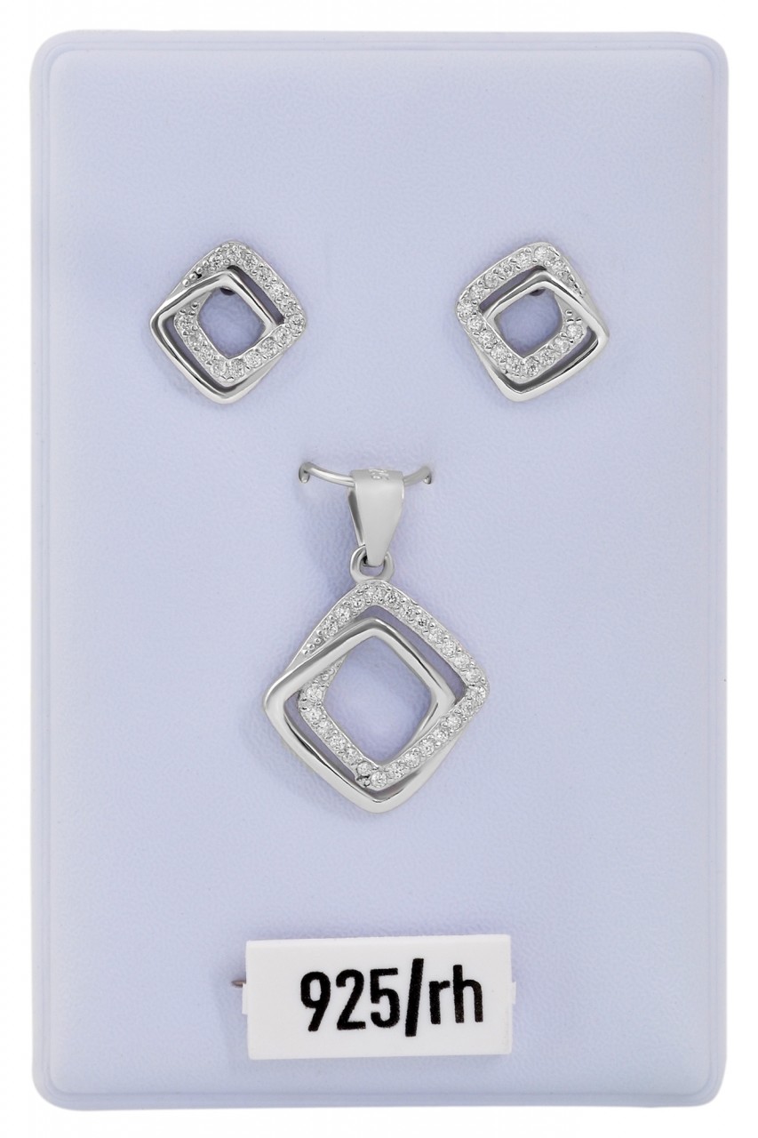 Conjunto feminino de joias quadradas composto por pingente e brincos, com 58 pedras de zircônia transparentes. É feito de prata 925/banhado a ródio com proteção contra manchas. O conjunto tem as seguintes dimensões do pingente: Comprimento: 17 mm Largura: 14 mm Espessura: 2 mm Brincos: Comprimento: 10 mm Largura: 10 mm Espessura: 2 mm e peso de 2,48 gramas