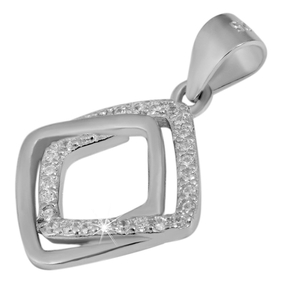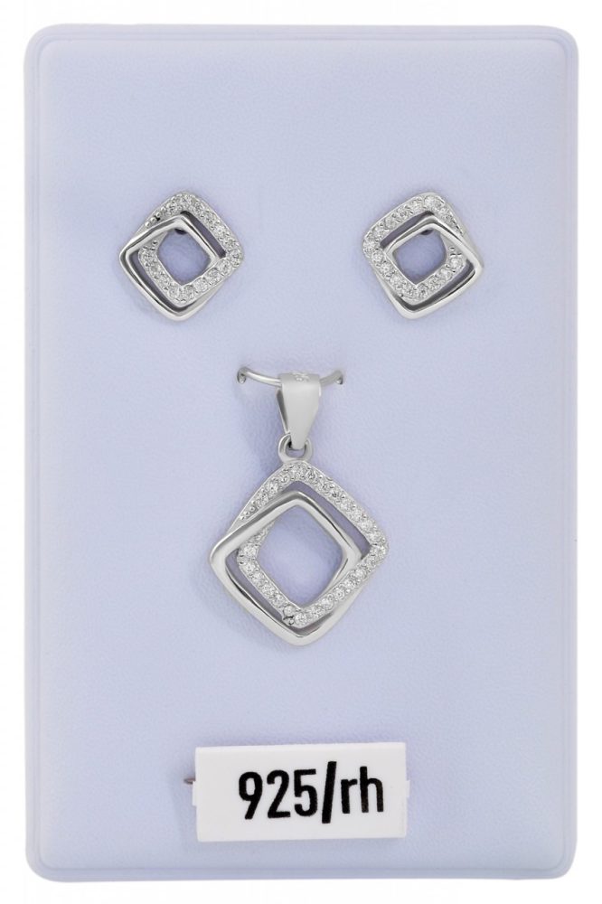 Conjunto feminino de joias quadradas composto por pingente e brincos, com 58 pedras de zircônia transparentes. É feito de prata 925/banhado a ródio com proteção contra manchas. O conjunto tem as seguintes dimensões do pingente: Comprimento: 17 mm Largura: 14 mm Espessura: 2 mm Brincos: Comprimento: 10 mm Largura: 10 mm Espessura: 2 mm e peso de 2,48 gramas
