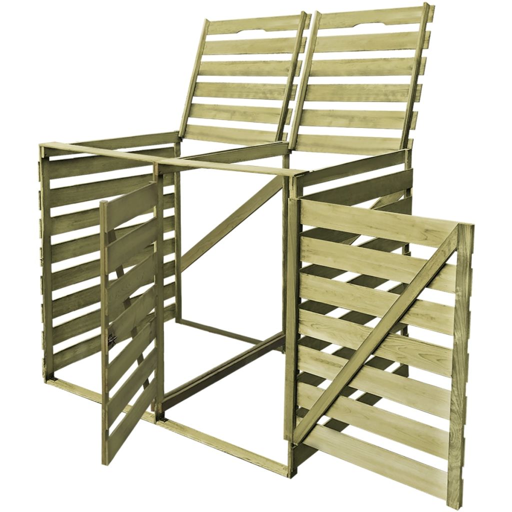 Feito com madeira de pinho impregnada a verde, com certificação FSC, este abrigo para caixotes do lixo é muito forte, durável e resistente ao apodrecimento. Este abrigo consegue acomodar 2 caixotes do lixo com 240 L (com uma altura máxima de 115 cm) e irá adaptar-se perfeitamente à decoração do seu jardim. Nota: Os caixotes do lixo não estão incluídos na entrega.