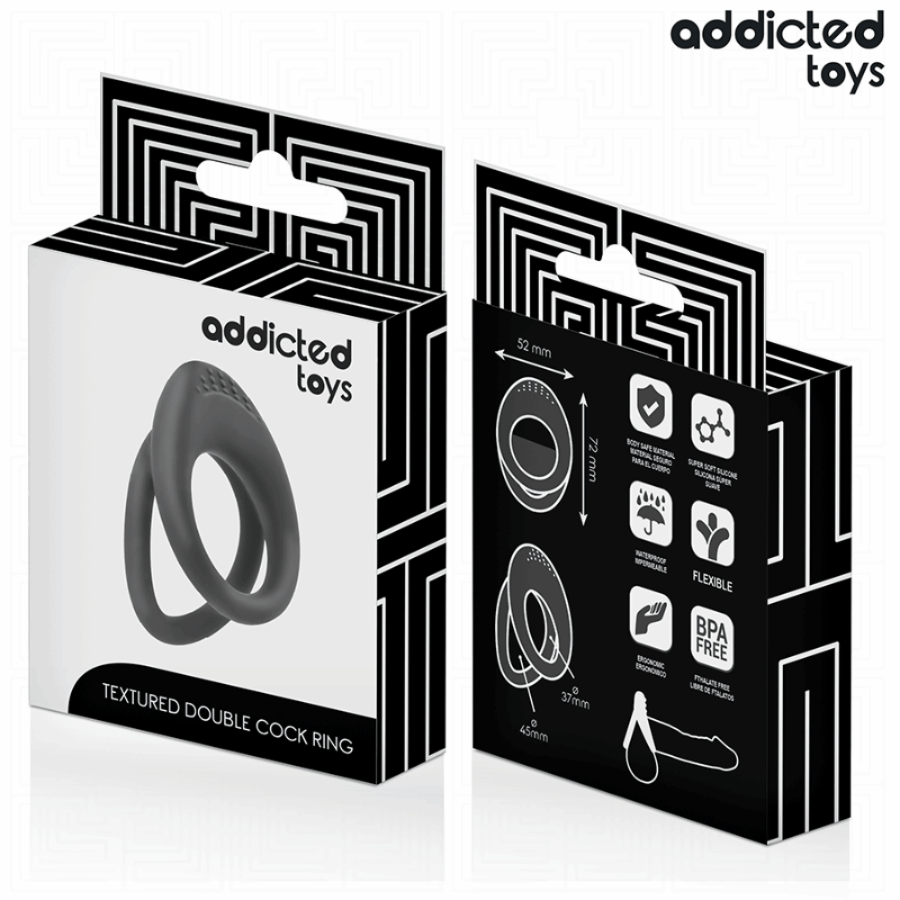 O anel peniano texturizado duplo Addicted Toys foi projetado para aumentar a estimulação e fornecer um ajuste firme, ajudando a prolongar sua ereção e aumentar a intensidade do prazer. Seu design de anel duplo permite uma fixação mais eficiente, enquanto sua superfície texturizada adiciona estimulação extra.