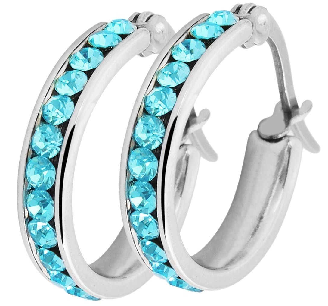 Os brincos de argola são feitos de aço inoxidável. Eles podem ser abertos e fechados com um fecho de clipe clássico, também feito de aço inoxidável, e firmemente preso ao orifício da orelha. Os brincos elegantes são decorados com 21 pedras ornamentadas. As dimensões são 13 mm de diâmetro, 3,5 mm de largura e 2 mm de espessura.