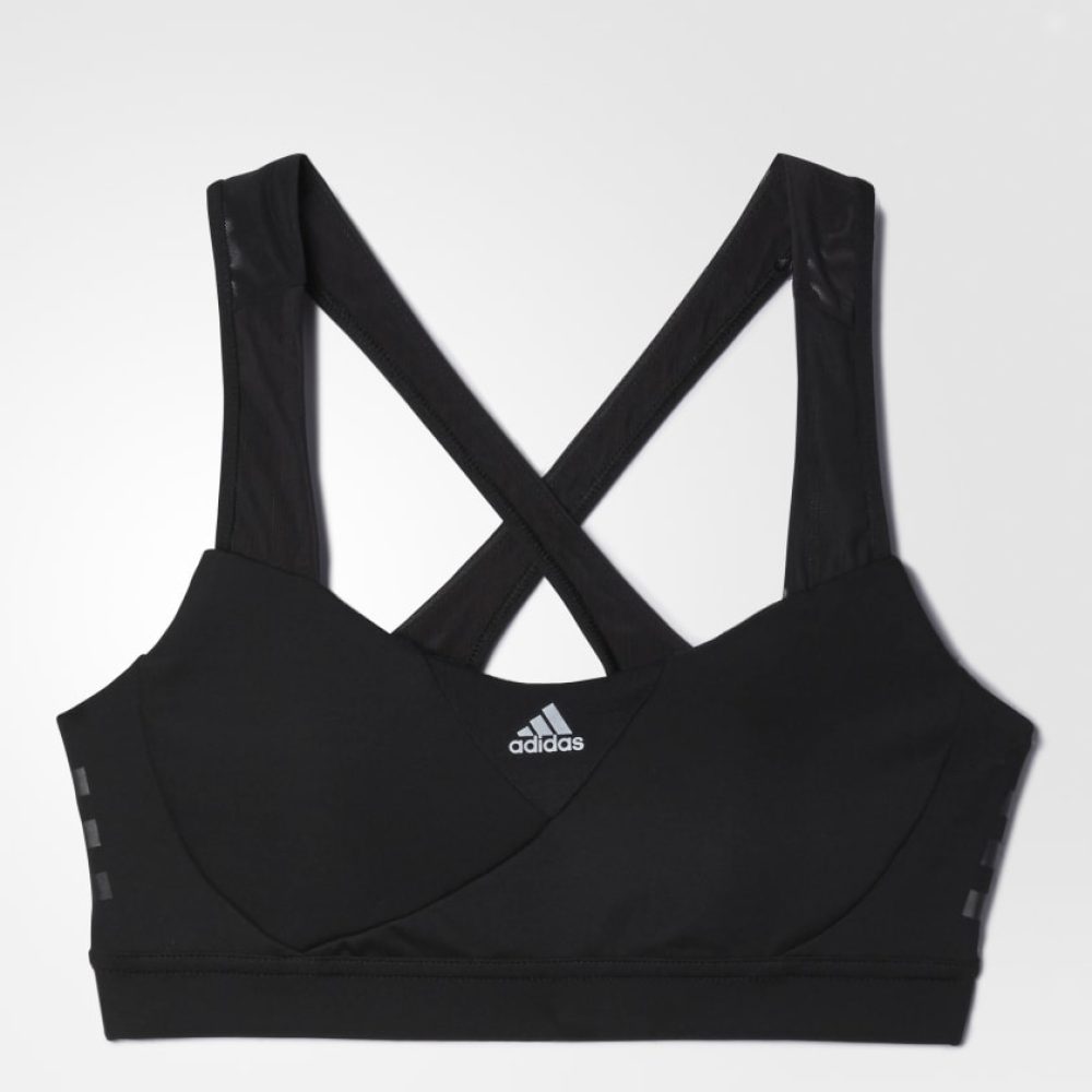 - Alças cruzadas flexíveis, costura suave e Três Listras em silk screen para conforto