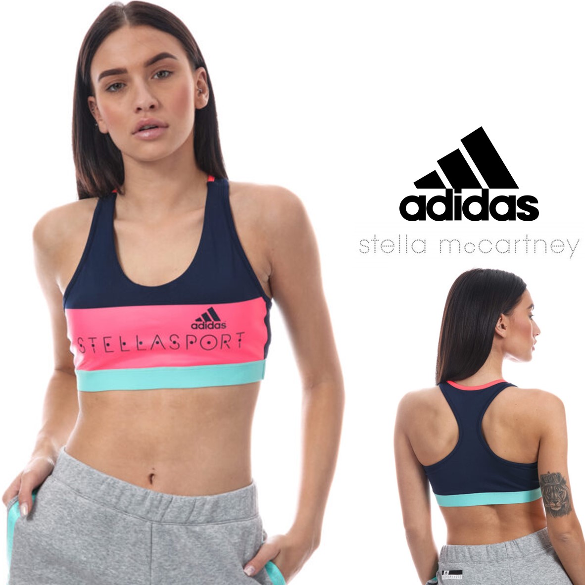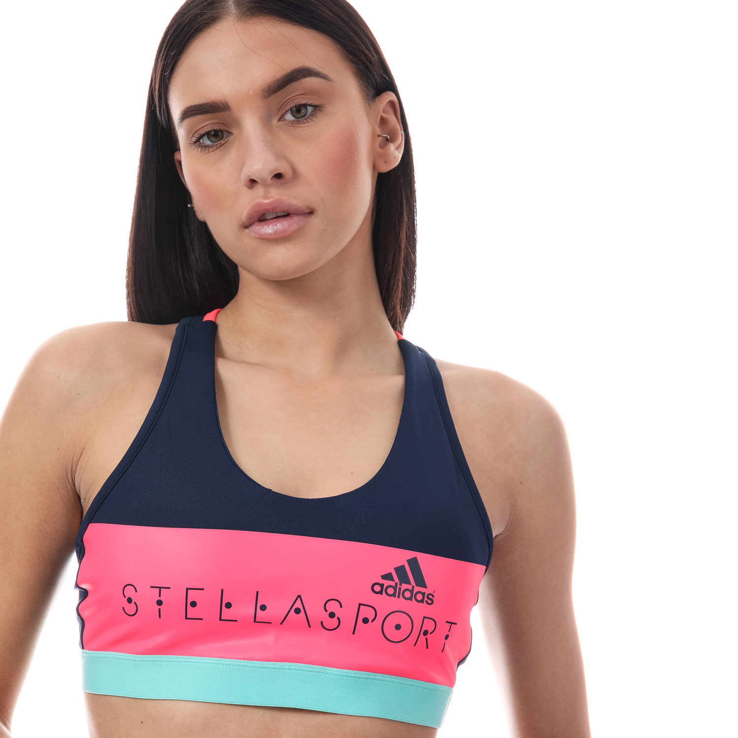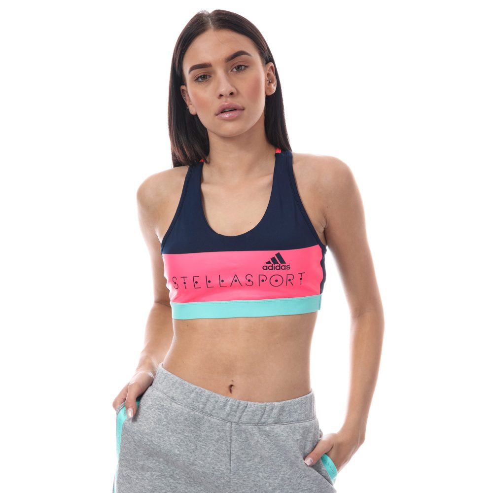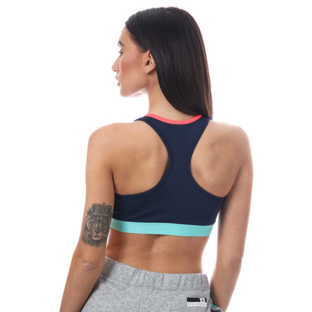 Sutiã Desportivo em malha azul marinho e rosa neon estampado com colorblock, tem alças de decote redondo, levemente acolchoado, costas nadador e busto elástico.