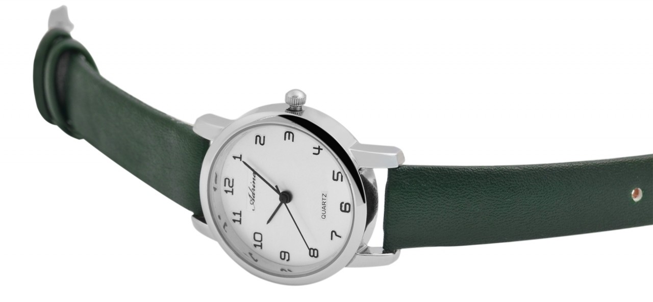 O relógio de pulso analógico de 3 ponteiros para senhora da marca Adrina tem um movimento de quartzo de alta qualidade. A bracelete em imitação de pele tem 14 mm de largura na extremidade e pode ser aberta e fechada com uma fivela de pino. O comprimento total do relógio é de 21 cm. A caixa metálica com vidro mineral tem um diâmetro de 29 mm e uma altura de 8 mm. O fundo da caixa é feito de aço inoxidável. O contraste de cores entre o mostrador brilhante e os ponteiros e índices pretos facilita a visualização das horas num relance. Com o seu design clássico e simples, obtém um relógio para todas as ocasiões que também é ideal como presente.