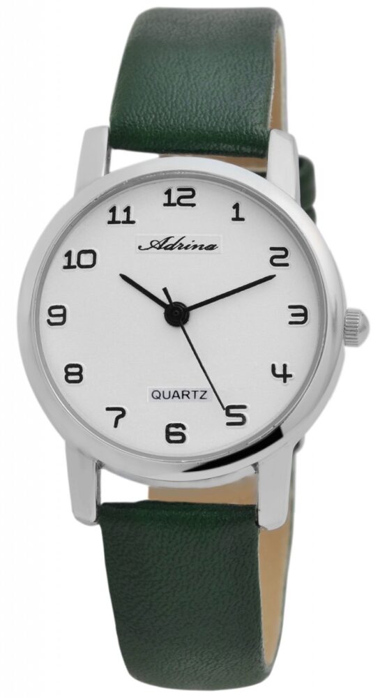 O relógio de pulso analógico de 3 ponteiros para senhora da marca Adrina tem um movimento de quartzo de alta qualidade. A bracelete em imitação de pele tem 14 mm de largura na extremidade e pode ser aberta e fechada com uma fivela de pino. O comprimento total do relógio é de 21 cm. A caixa metálica com vidro mineral tem um diâmetro de 29 mm e uma altura de 8 mm. O fundo da caixa é feito de aço inoxidável. O contraste de cores entre o mostrador brilhante e os ponteiros e índices pretos facilita a visualização das horas num relance. Com o seu design clássico e simples, obtém um relógio para todas as ocasiões que também é ideal como presente.