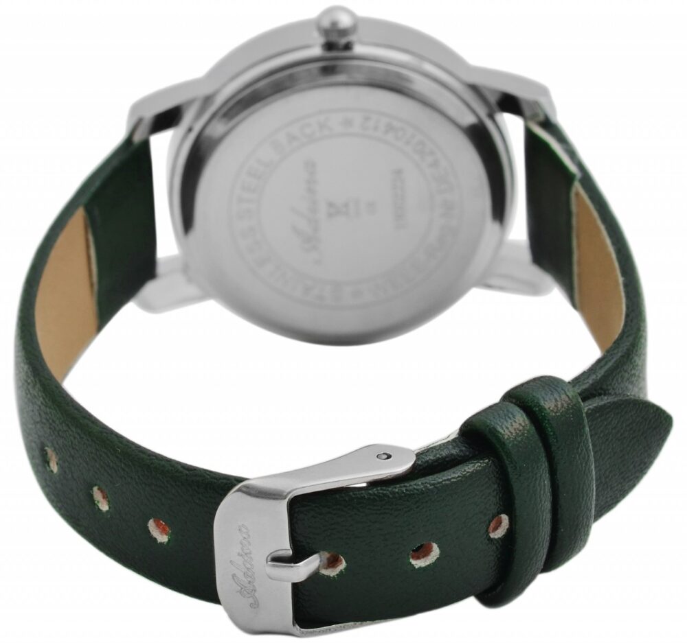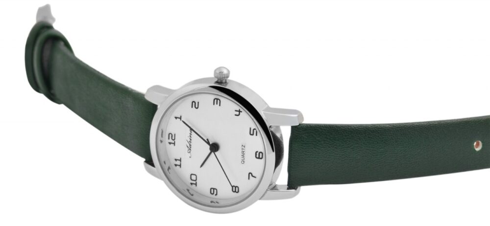 O relógio de pulso analógico de 3 ponteiros para senhora da marca Adrina tem um movimento de quartzo de alta qualidade. A bracelete em imitação de pele tem 14 mm de largura na extremidade e pode ser aberta e fechada com uma fivela de pino. O comprimento total do relógio é de 21 cm. A caixa metálica com vidro mineral tem um diâmetro de 29 mm e uma altura de 8 mm. O fundo da caixa é feito de aço inoxidável. O contraste de cores entre o mostrador brilhante e os ponteiros e índices pretos facilita a visualização das horas num relance. Com o seu design clássico e simples, obtém um relógio para todas as ocasiões que também é ideal…