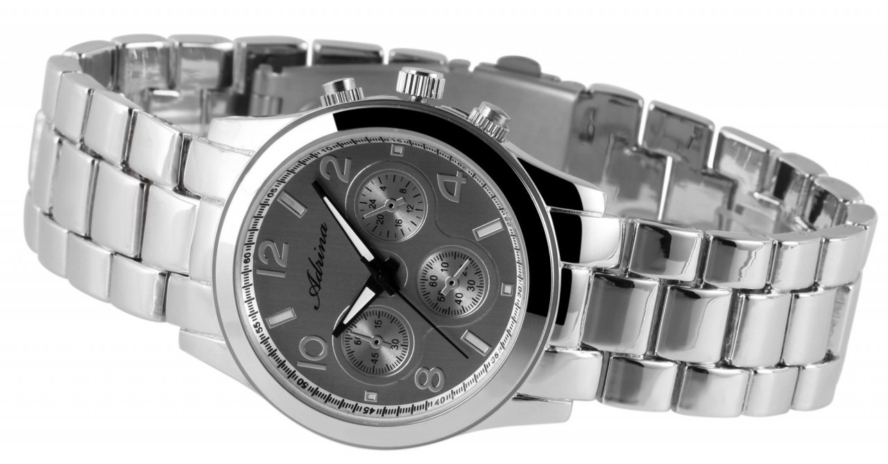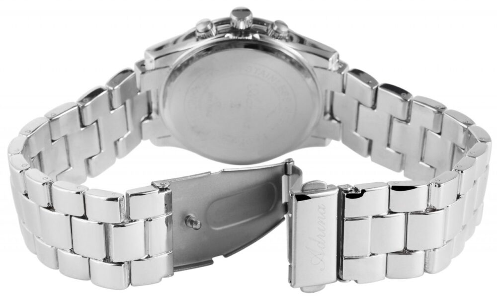 O relógio analógico feminino da Adrina tem um movimento de quartzo de alta qualidade. O nome do modelo é AR0002. A pulseira de metal tem 20 mm de largura e abre com um fecho dobrável de aço inoxidável. O comprimento total é de 21 cm. A caixa de metal com vidro mineral tem uma dimensão de 37 mm e uma altura de caixa de 12 mm. A tampa da caixa é feita de aço inoxidável. Outro recurso é: Chronolook.