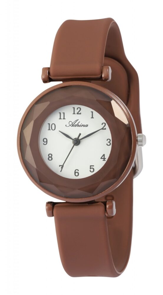 Este relógio feminino da marca Adrina é a combinação perfeita de estilo e funcionalidade, combinando design moderno com confiabilidade funcional. O relógio está disponível em várias cores da moda. Um destaque especial é o atraente anel do mostrador, cuja cor combina perfeitamente com a imagem geral. A pulseira é confecionada em silicone macio e flexível, o que garante alto nível de conforto e cabe confortavelmente no pulso. A robusta caixa de metal não só confere ao relógio uma aparência moderna, mas também uma durabilidade impressionante. O vidro mineral facetado é cortado em diferentes ângulos, criando um design esteticamente agradável e acrescentando um toque único. O relógio possui display analógico com três ponteiros e algarismos arábicos de fácil leitura e índice de linhas, o que garante uma leitura clara e fácil.