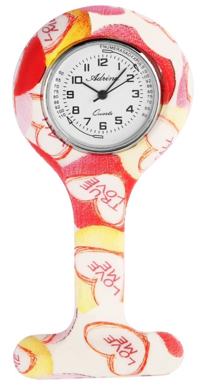 O relógio de enfermeira analógico de 3 ponteiros da marca Adrina tem um movimento de quartzo de alta qualidade e está disponível em várias cores e padrões. A caixa do relógio é revestida a silicone, tornando-o particularmente fácil de limpar e higiénico. Para prender o relógio, é utilizado um alfinete de segurança fino com um fecho de torção seguro. O comprimento total do relógio é de 8,5 cm, a largura de 4 cm e a espessura de 1 cm. A parte de trás da caixa é feita de aço inoxidável e existe um recesso no silicone na parte de trás da caixa para que a pilha no interior possa ser facilmente substituída. Além disso, o fundo da caixa pode ser gravado individualmente com uma grande variedade de desenhos, tornando este relógio num acessório completamente personalizado. Isto faz deste modelo de relógio um ótimo presente para quem adora o seu trabalho ou para alguém que é apaixonado pelo seu trabalho.