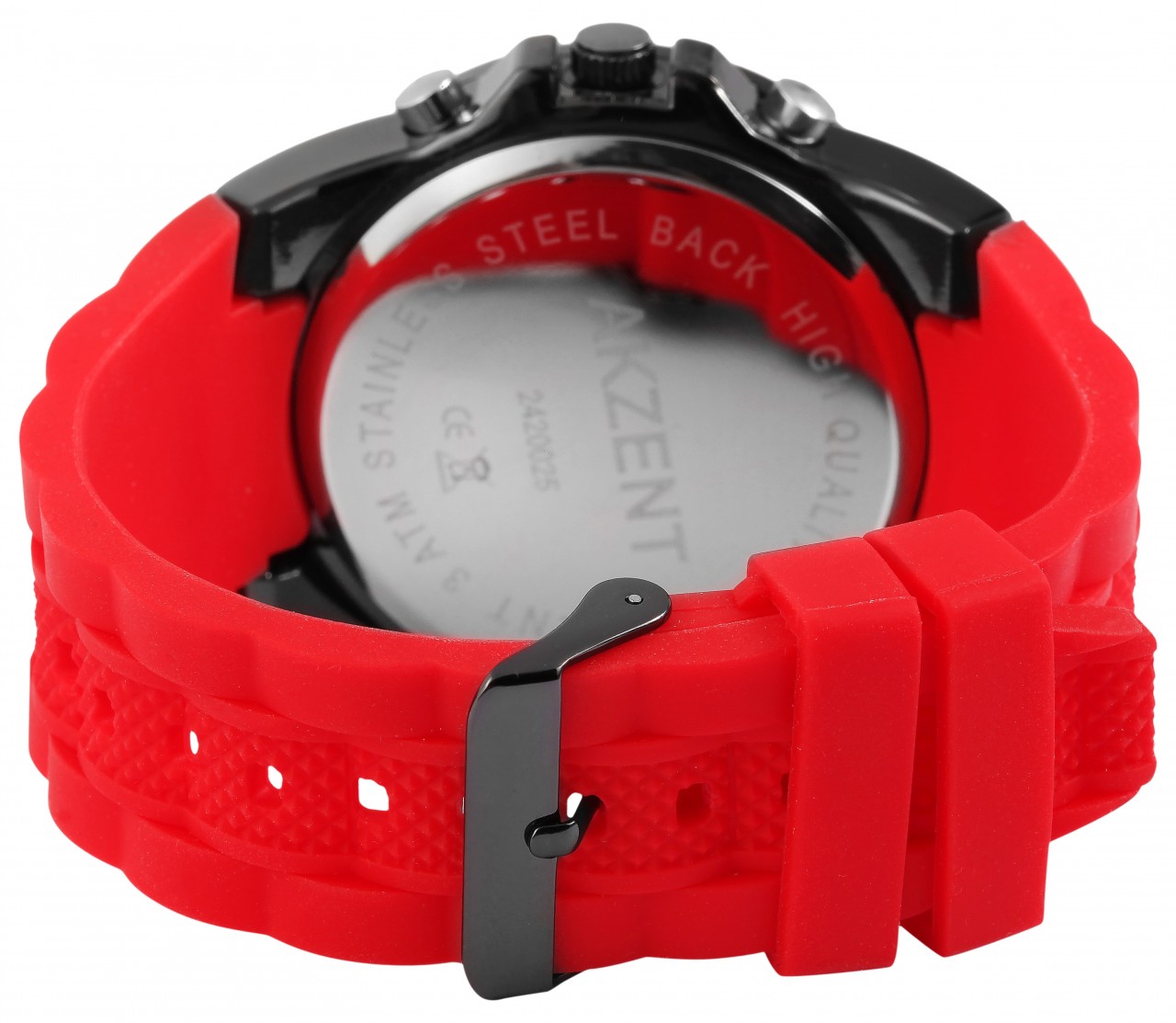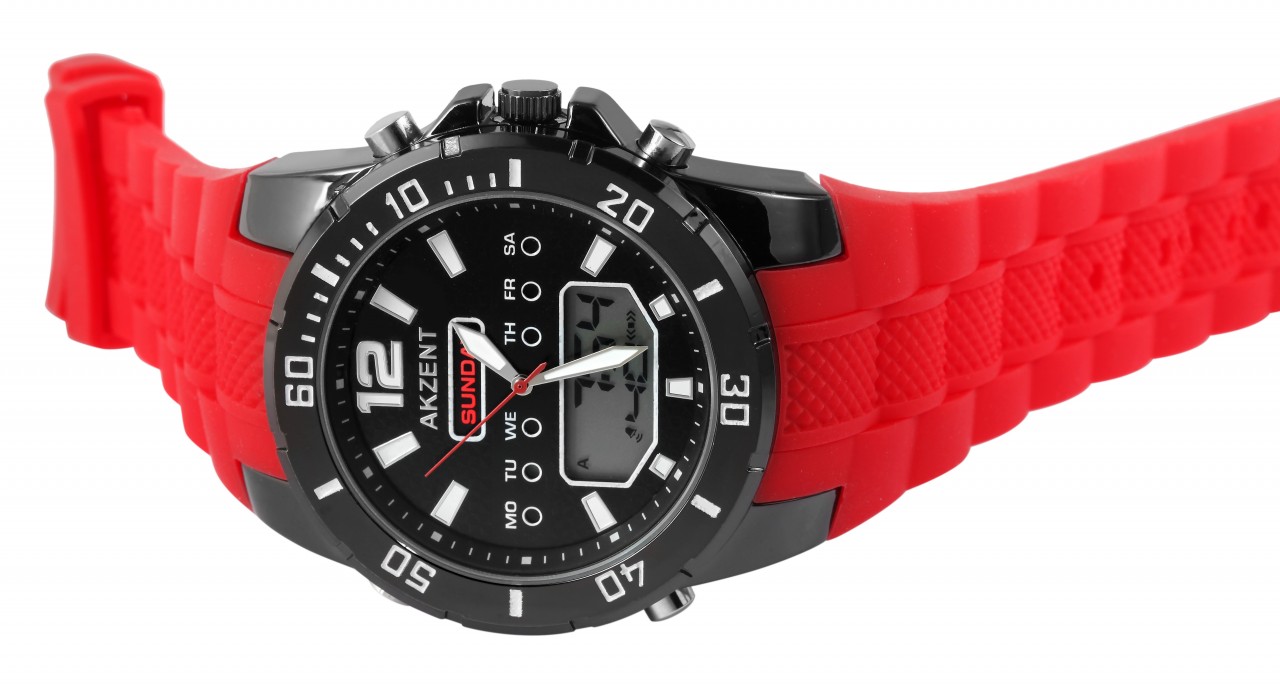 O relógio de pulso analógico-digital para homem da marca Praktik possui um movimento de quartzo de três ponteiros de alta qualidade e um movimento digital de alta qualidade. A pulseira de silicone tem 22 mm de largura na alça e pode ser aberta e fechada com uma fivela de aço inoxidável. O comprimento total do relógio é de 26,5 cm. A caixa metálica tem um diâmetro de 50 mm e uma altura de caixa de 15 mm. O fundo da caixa é feito de aço inoxidável e o relógio tem resistência à água de 3 bar. A hora analógica pode ser acertada através de uma coroa, a hora digital pode ser acertada através dos quatro botões…