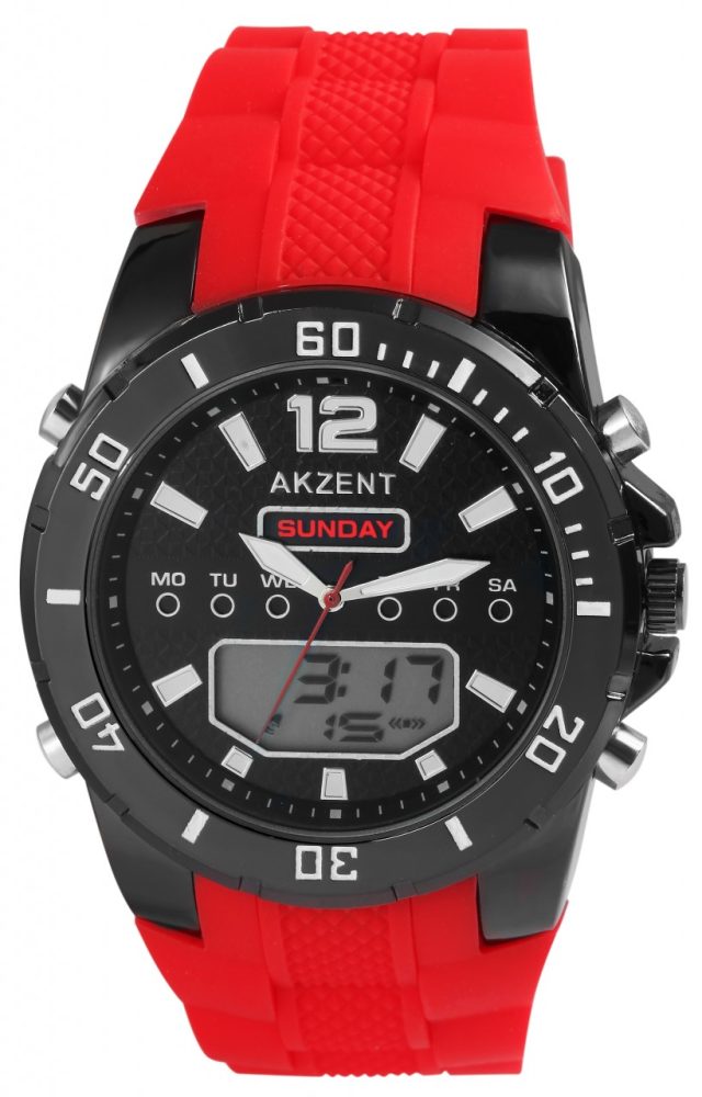 O relógio de pulso analógico-digital para homem da marca Praktik possui um movimento de quartzo de três ponteiros de alta qualidade e um movimento digital de alta qualidade. A pulseira de silicone tem 22 mm de largura na alça e pode ser aberta e fechada com uma fivela de aço inoxidável. O comprimento total do relógio é de 26,5 cm. A caixa metálica tem um diâmetro de 50 mm e uma altura de caixa de 15 mm. O fundo da caixa é feito de aço inoxidável e o relógio tem resistência à água de 3 bar. A hora analógica pode ser acertada através de uma coroa, a hora digital pode ser acertada através dos quatro botões…