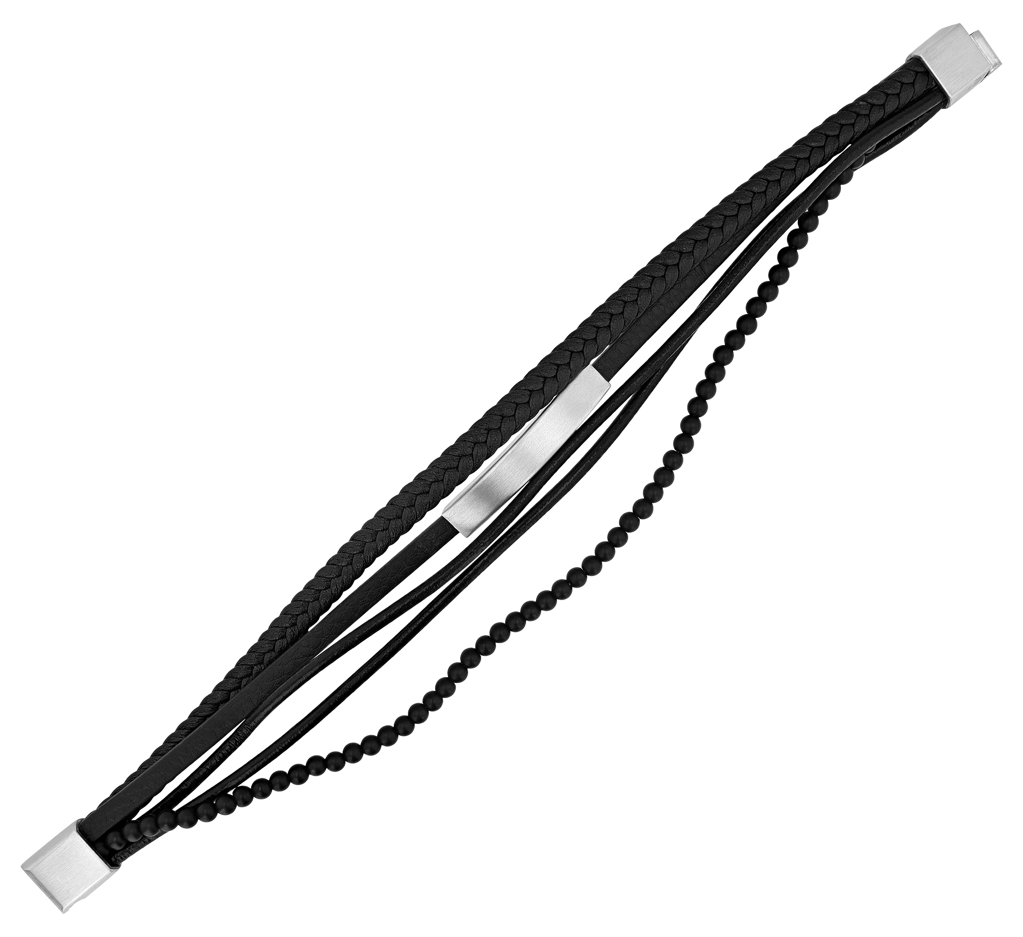 Marca:Akzent Género:Unisex Estilo:Moda Cor 1:Preto Cor 2:Prateado Peso do artigo em g:24 Material 2:Aço inoxidável Peso de envio do artigo em g:38 Tipo:Pulseira Cor 3:Preto Fecho:Aço inoxidável Fecho magnético Material 1:Couro de imitação Material 3:Ônix Altura em cm:0.85 Largura em cm:1.35 Nome do modelo:Aegir Extensão em cm:1 Gravação:Verdadeiro