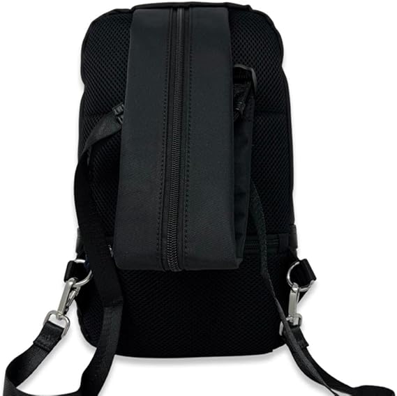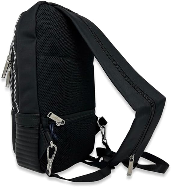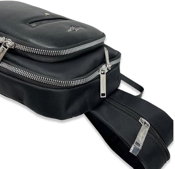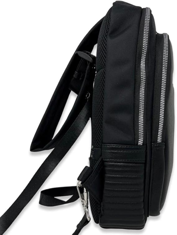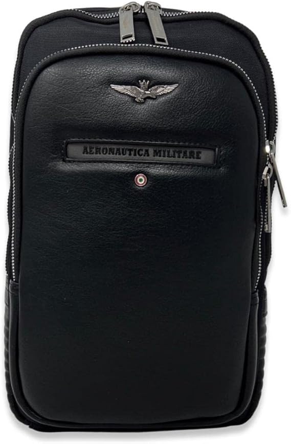 Uma bolsa de um ombro convertível em mochila, caracterizada pela combinação de dois materiais, pele sintética e tecido técnico, bem como um bolso frontal para smartphone com o logótipo da Aeronautica Militare.