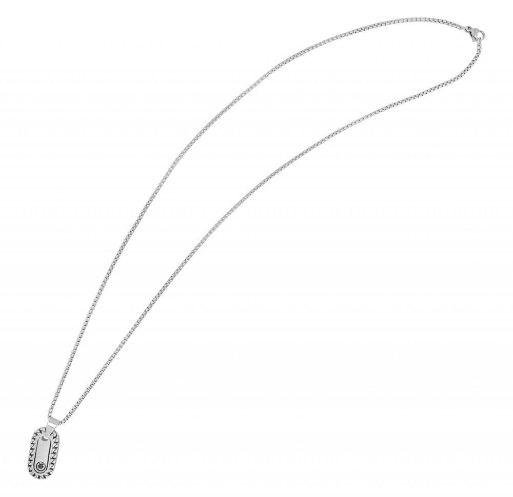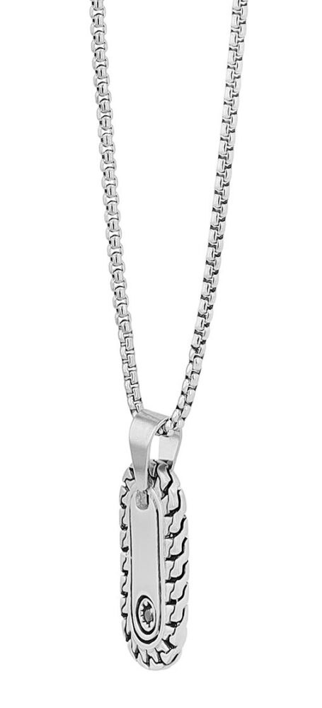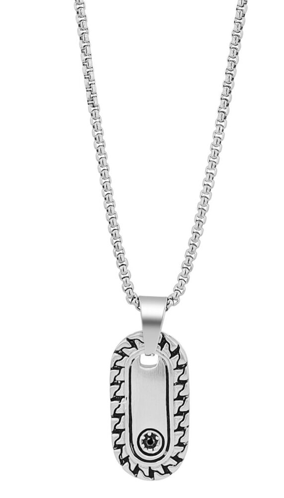 Este elegante colar em aço inoxidável combina um design intemporal com um toque pessoal. O pendente em forma oval, decorado com um padrão de rebordo apelativo, é cravejado com uma pedra de zircónia escura que acrescenta um toque subtil de elegância. Medindo 26 x 12 mm e com uma generosa argola de 11 mm, o pendente enegrecido é fácil de pôr e tirar. A corrente mede 60 cm de comprimento e o fecho de lagosta torna-a confortável de usar. A possibilidade de personalização é particularmente notável – sejam iniciais, uma data especial ou uma mensagem curta, o pendente não é apenas um acessório de moda, mas também um presente único com valor pessoal. Ideal para homens com estilo, que valorizam a qualidade e a individualidade.
