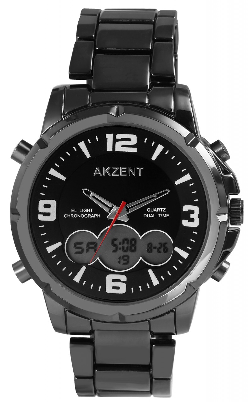 O relógio de pulso analógico-digital para homem da marca Praktik possui um movimento de quartzo de três ponteiros de alta qualidade e um movimento digital de alta qualidade. A pulseira em aço inoxidável tem 24 mm de largura na alça e pode ser aberta e fechada com um fecho dobrável em aço inoxidável. Devido aos elementos removíveis, a pulseira pode ser ajustada a qualquer circunferência do pulso. O comprimento total do relógio é de 22 cm. A caixa de metal com vidro mineral tem um diâmetro de 48 mm e uma altura de 15 mm. O fundo da caixa é feito de aço inoxidável e o relógio tem resistência à água de 3 bar. A hora analógica pode ser acertada através de uma coroa, a hora digital pode ser acertada através dos quatro botões localizados às duas, quatro, oito e dez horas. Todas as outras funções, como a função de parada, a função de alarme e a iluminação do…