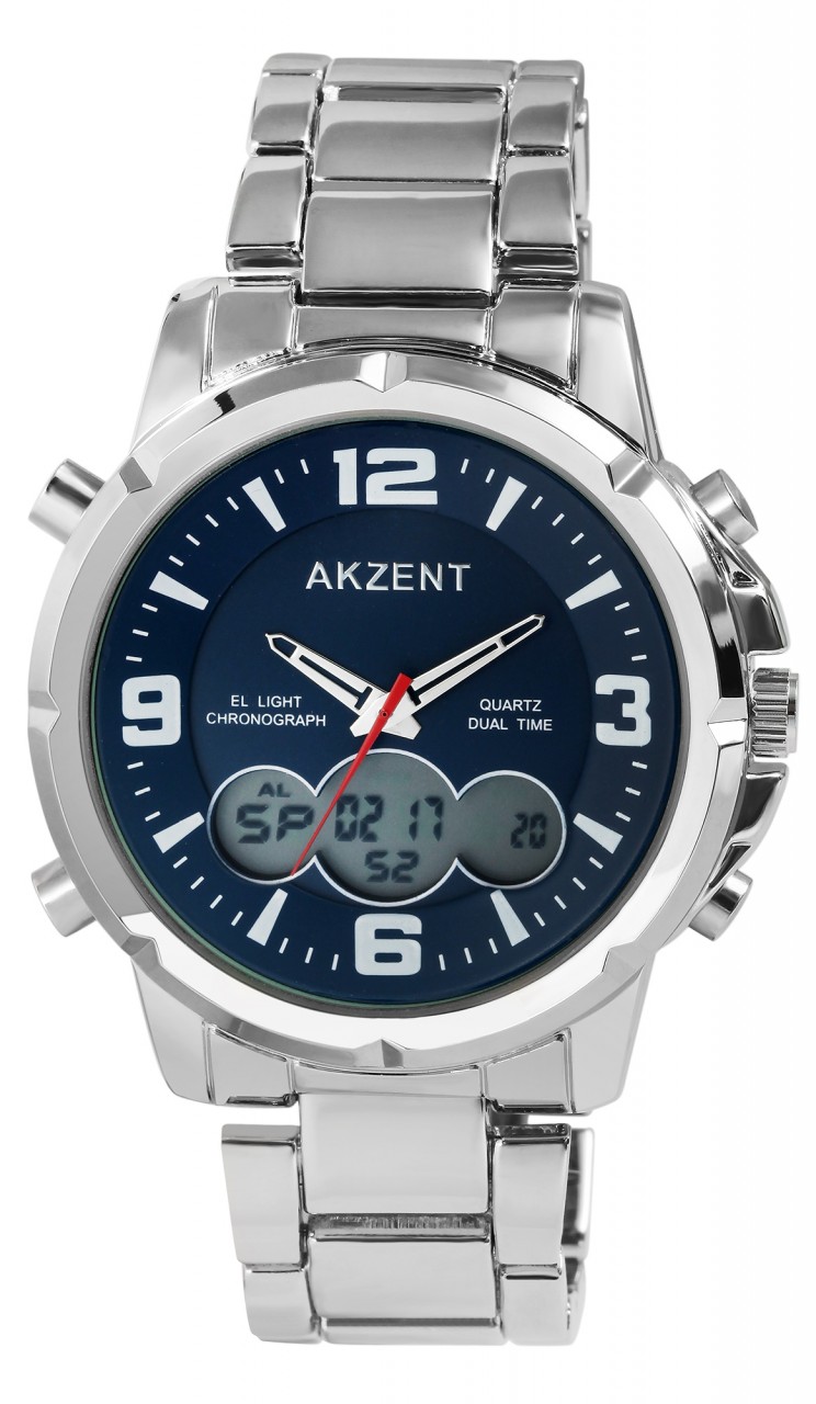 O relógio de pulso analógico-digital para homem da marca Praktik possui um movimento de quartzo de três ponteiros de alta qualidade e um movimento digital de alta qualidade. A pulseira em aço inoxidável tem 24 mm de largura na alça e pode ser aberta e fechada com um fecho dobrável em aço inoxidável. Devido aos elementos removíveis, a pulseira pode ser ajustada a qualquer circunferência do pulso. O comprimento total do relógio é de 22 cm. A caixa de metal com vidro mineral tem um diâmetro de 48 mm e uma altura de 15 mm. O fundo da caixa é feito de aço inoxidável e o relógio tem resistência à água de 3 bar. A hora analógica pode ser acertada através de uma coroa, a hora digital pode ser acertada através dos quatro botões localizados às duas, quatro, oito e dez horas. Todas as outras funções, como a função de parada, a função de alarme e a iluminação do…