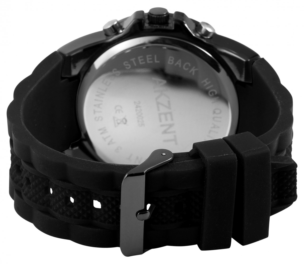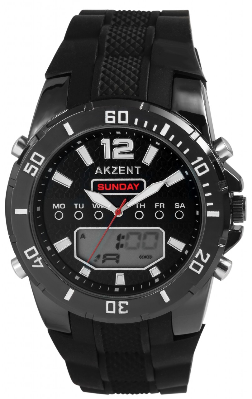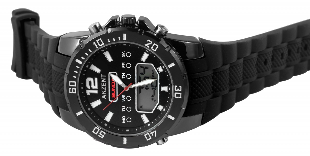 O relógio de pulso analógico-digital para homem da marca Akzent possui um movimento de quartzo de três ponteiros de alta qualidade e um movimento digital de alta qualidade. A pulseira de silicone tem 22 mm de largura na alça e pode ser aberta e fechada com uma fivela de aço inoxidável. O comprimento total do relógio é de 26,5 cm. A caixa metálica tem um diâmetro de 50 mm e uma altura de caixa de 15 mm. O fundo da caixa é feito de aço inoxidável e o relógio tem resistência à água de 3 ATM. A hora analógica pode ser acertada através de uma coroa, a hora digital pode ser acertada através dos quatro botões localizados às duas, quatro, oito e dez horas. Todas as outras funções, como a função de parada, a função de alarme e a iluminação do display, também podem ser operadas através dos botões.
