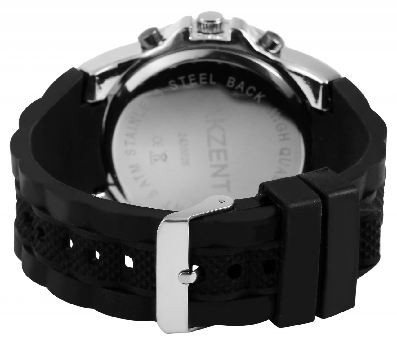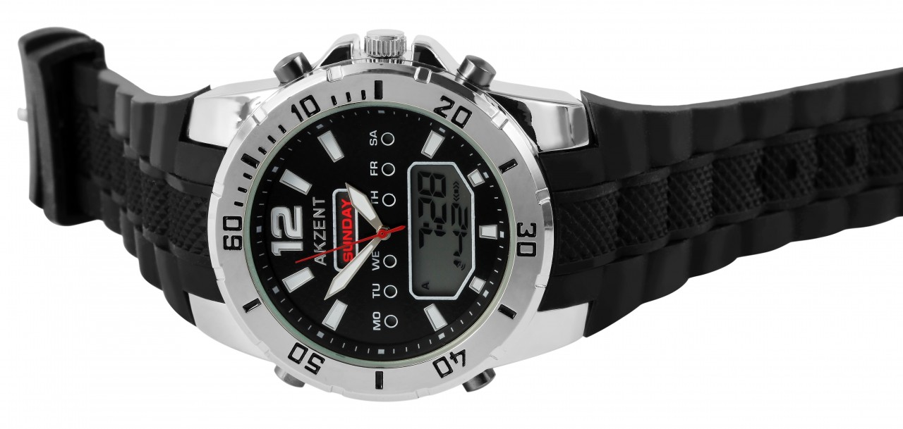 O relógio de pulso analógico-digital para homem da marca Praktik possui um movimento de quartzo de três ponteiros de alta qualidade e um movimento digital de alta qualidade. A pulseira de silicone tem 22 mm de largura na alça e pode ser aberta e fechada com uma fivela de aço inoxidável. O comprimento total do relógio é de 26,5 cm. A caixa metálica tem um diâmetro de 50 mm e uma altura de caixa de 15 mm. O fundo da caixa é feito de aço inoxidável e o relógio tem resistência à água de 3 bar. A hora analógica pode ser acertada através de uma coroa, a hora digital pode ser acertada através dos quatro botões…