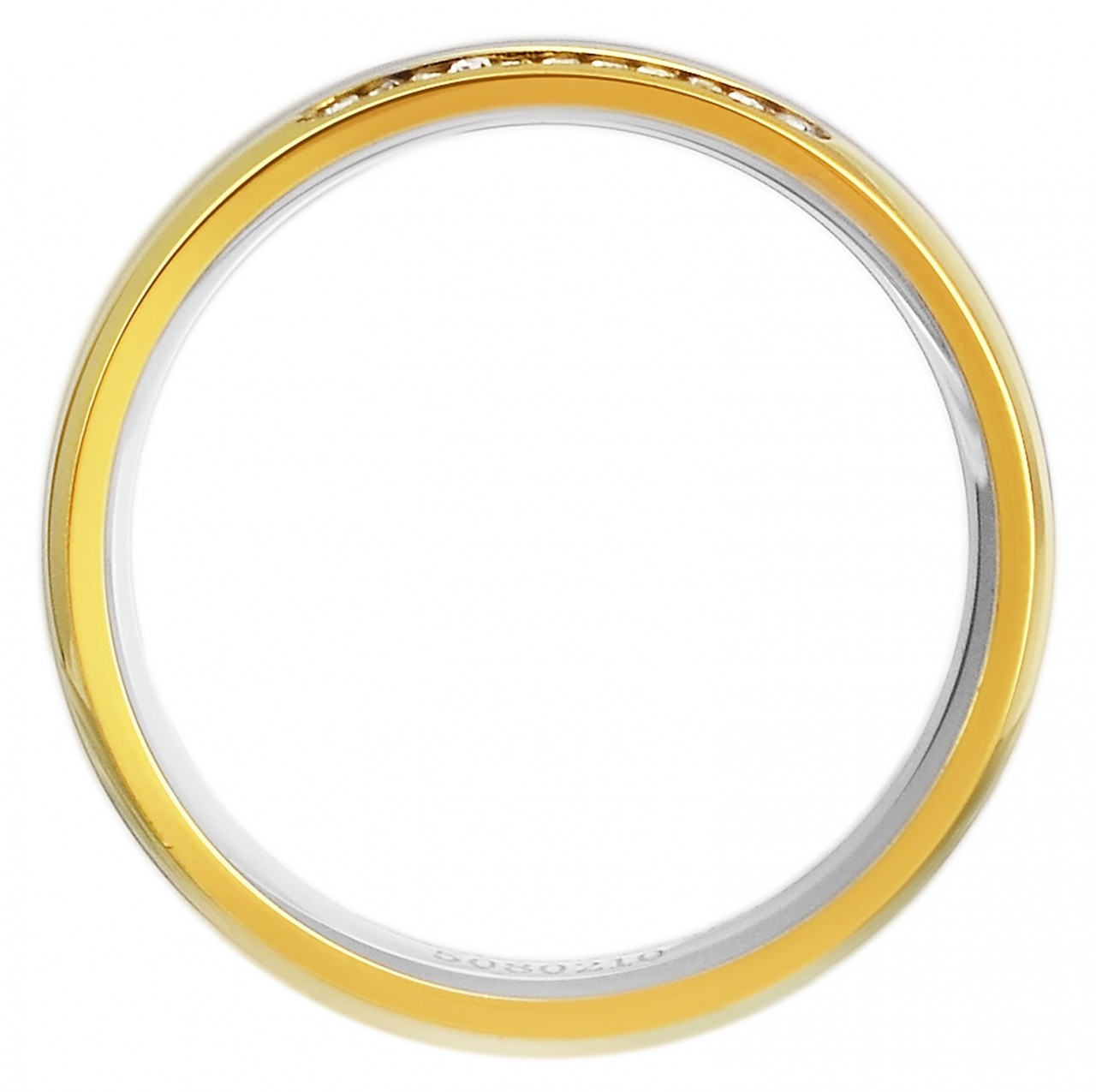O anel de aço inoxidável da marca Praktik é um anel de parceiro feminino que está disponível nos tamanhos 52 – 62. Tem largura de 6 mm e espessura de material de 2 mm. O anel tem um visual bicolor emocionante com onze pedras simil medindo 1 mm. A superfície prateada é mate e a superfície dourada com 1 mm de largura é polida. O anel pode ser gravado no interior, tornando esta joia uma companheira muito pessoal.