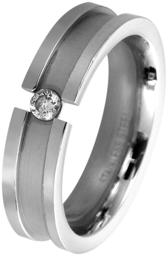 O anel feminino da marca Praktik é feito de aço inoxidável e está disponível nos tamanhos 48 – 64. As dimensões resultam de uma largura de 6 mm e uma espessura de material de 2 mm. A superfície do anel prateado é mate escovada e decorada com uma pedra simili no meio. A coroação também garante que o anel seja particularmente confortável de usar.
