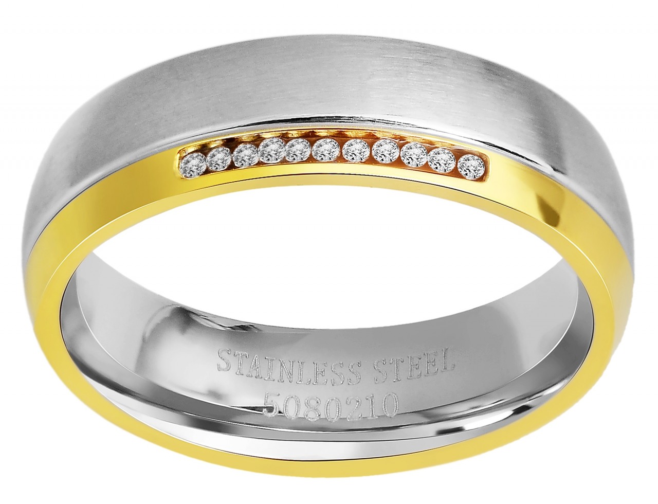 O anel de aço inoxidável da marca Praktik é um anel de parceiro feminino que está disponível nos tamanhos 52 – 62. Tem largura de 6 mm e espessura de material de 2 mm. O anel tem um visual bicolor emocionante com onze pedras simil medindo 1 mm. A superfície prateada é mate e a superfície dourada com 1 mm de largura é polida. O anel pode ser gravado no interior, tornando esta joia uma companheira muito pessoal.