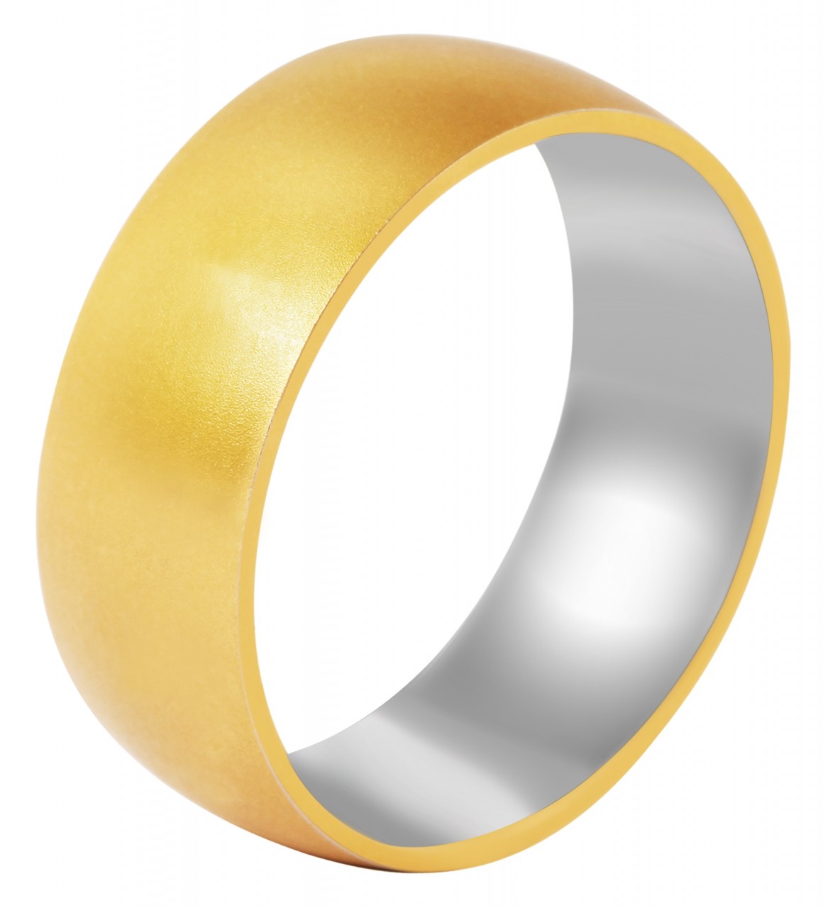 O anel parceiro feminino é feito de aço inoxidável e está disponível nos tamanhos 52, 54, 56, 58, 60 e 62. Este anel feminino é dourado por fora e prateado por dentro. A superfície do anel é mate como areia. Este tipo de tratamento de superfície confere ao anel uma aparência simples e elegante. O aço inoxidável é um material muito robusto que confere ao anel uma longa vida útil. A espessura do material é de 2 mm e o anel tem 8 mm de largura em cada tamanho. O anel feminino é ligeiramente curvado por dentro, o que o torna confortável de usar.