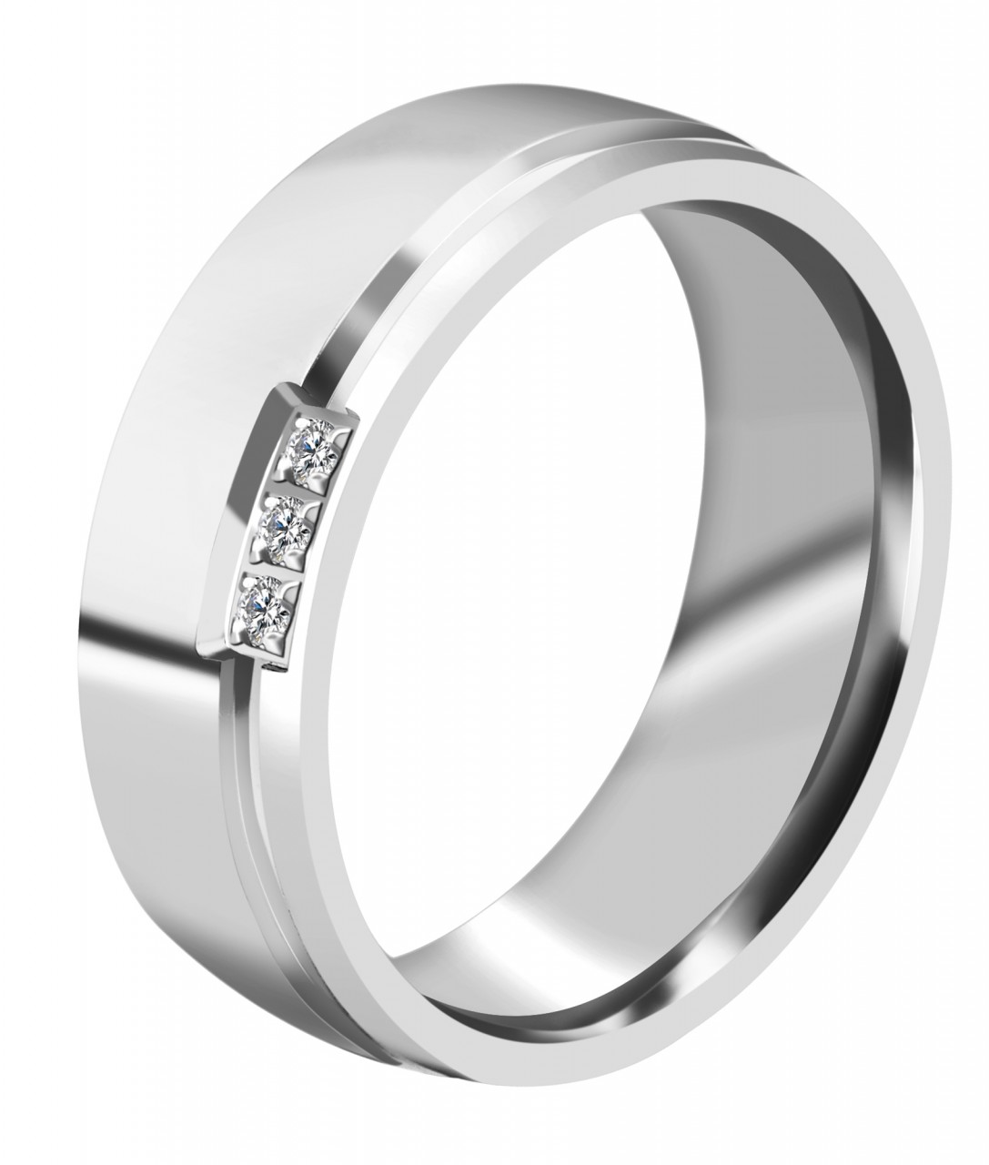 O anel parceiro feminino é feito de aço inoxidável e está disponível nos tamanhos 50, 52, 54, 56, 58, 60 e 62. O anel feminino é prateado e possui um entalhe na borda superior. Além disso, três pedras de zircônia são fixadas no nível do entalhe. A superfície do anel é altamente polida. O aço inoxidável é um material robusto que confere ao anel uma longa vida útil. A espessura do material é de 2 mm e o anel tem 7 mm de largura em cada tamanho. O anel feminino é ligeiramente curvado por dentro, tornando-o extremamente confortável de usar.