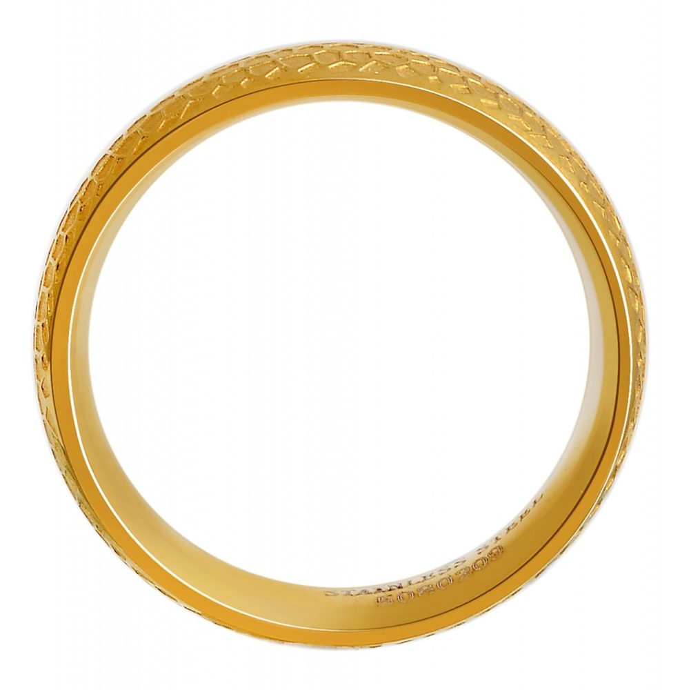 O anel de aço inoxidável dourado da marca Praktik é um anel de parceiro masculino que está disponível nos tamanhos 58-72. Tem largura de 6 mm e espessura de material de 2 mm. O visual tem acabamento superficial fosco e estruturado, o que confere ao anel um visual único. Também pode ser decorado com gravuras pessoais no interior. Com este produto você recebe um anel de parceiro especial que é um símbolo de coesão eterna.