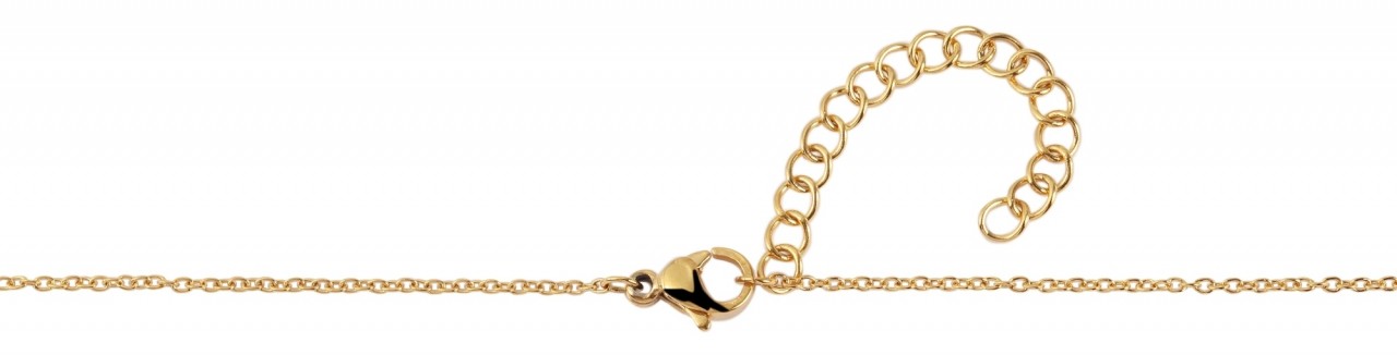 O colar dourado da marca Akzent é feito em aço inoxidável com padrão de âncora. Além disso, a corrente de joias é refinada com revestimento iônico de alta qualidade. Uma grande letra do alfabeto está presa à corrente no meio com dois ilhós redondos. A corrente pode ser aberta e fechada com um mosquetão dourado, também feito em aço inoxidável. Além disso, em uma das pontas da corrente é fixada uma corrente extensora de 5 cm de comprimento, que permite variar o comprimento em até 5 cm e, portanto, pode ser adaptada a qualquer roupa. As dimensões resultam de um comprimento total de 43 cm e uma espessura de corrente de 1 mm.