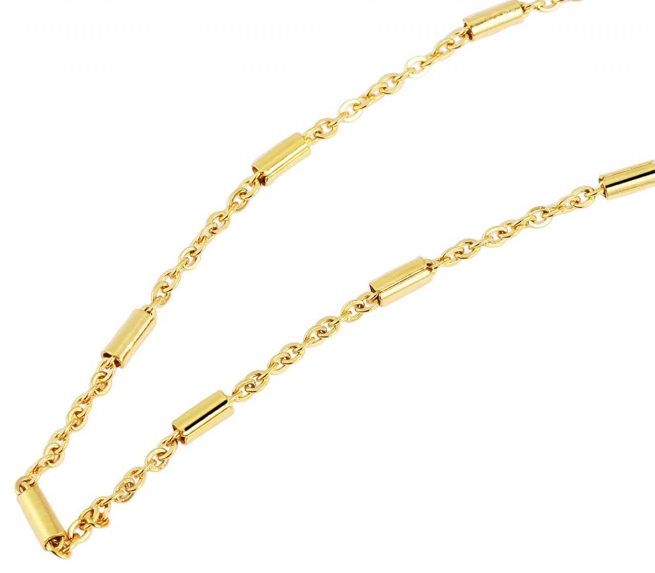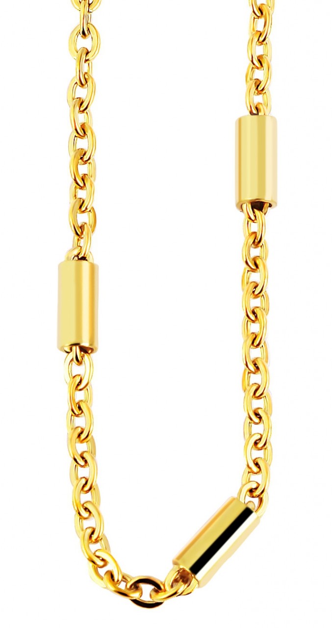 A corrente de âncora dourada da marca Praktik é feita de aço inoxidável e possui elementos cilíndricos de aço inoxidável incorporados em intervalos regulares. Pode ser aberto e fechado com um mosquetão dourado, também feito de aço inoxidável. O colar está disponível em comprimentos de 45 cm e 55 cm. Além disso, uma corrente extensora de 5 cm de comprimento é fixada em uma das pontas da corrente para que o comprimento possa variar em até 5 cm e a joia possa ser adaptada a qualquer look. A espessura do colar é de 2 mm.