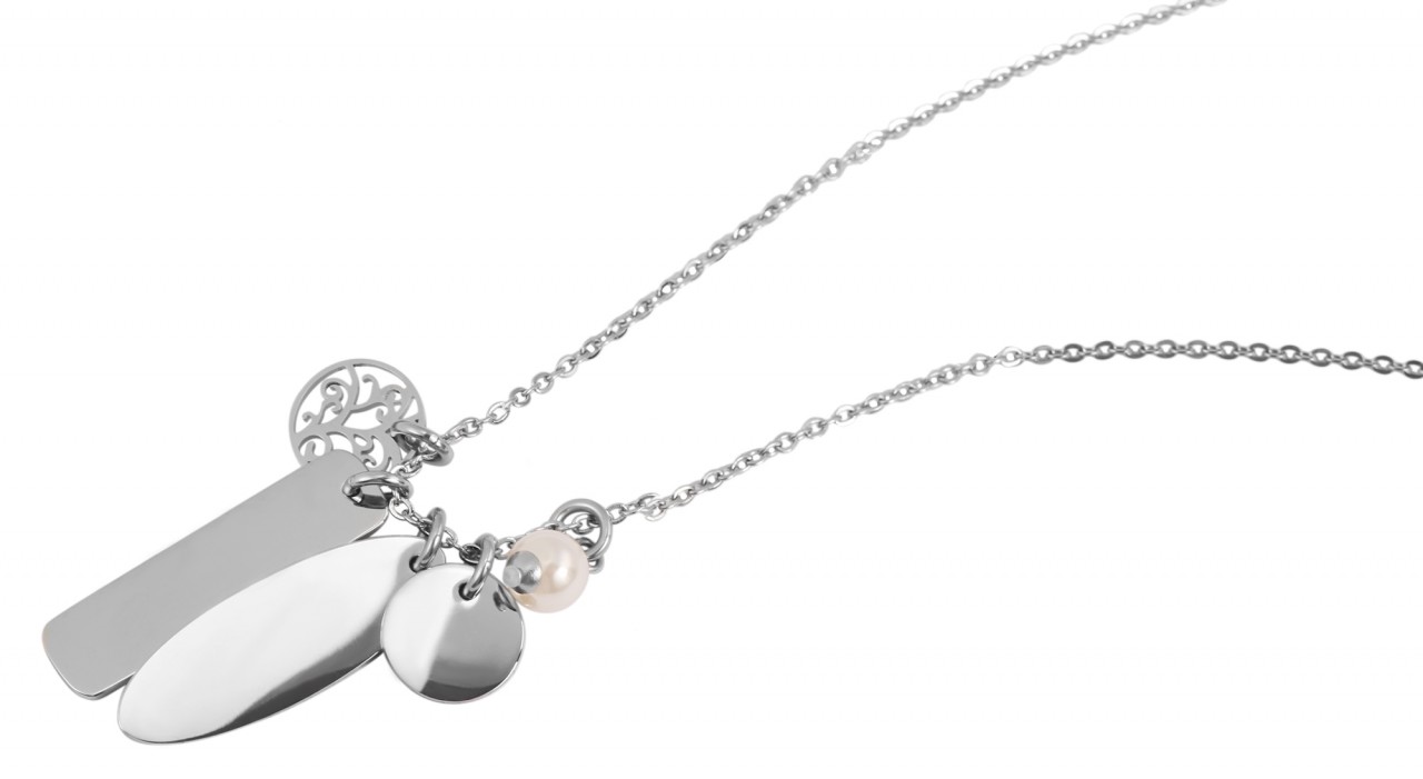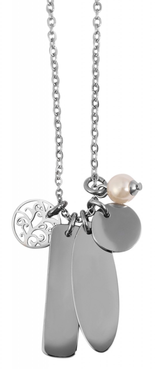 Descubra a variedade deste colar com cinco pingentes diferentes – cada um único e individual. A corrente no popular padrão de corrente de âncora tem 43 cm de comprimento e é feita de aço inoxidável durável. O fecho lagosta clássico garante uma fixação fácil e segura. Existem cinco pingentes muito diferentes na corrente. Um pingente redondo ornamentado, um pequeno pingente de pérola falsa e três pingentes gravados de tamanhos diferentes, oferecendo a opção de gravuras personalizadas para adicionar um toque pessoal. A corrente de joias pode ser combinada perfeitamente e oferece a oportunidade de expressar de maneira ideal sua própria personalidade e senso de estilo. A combinação do aço inoxidável brilhante e dos vários pingentes fazem deste colar um ótimo acessório.