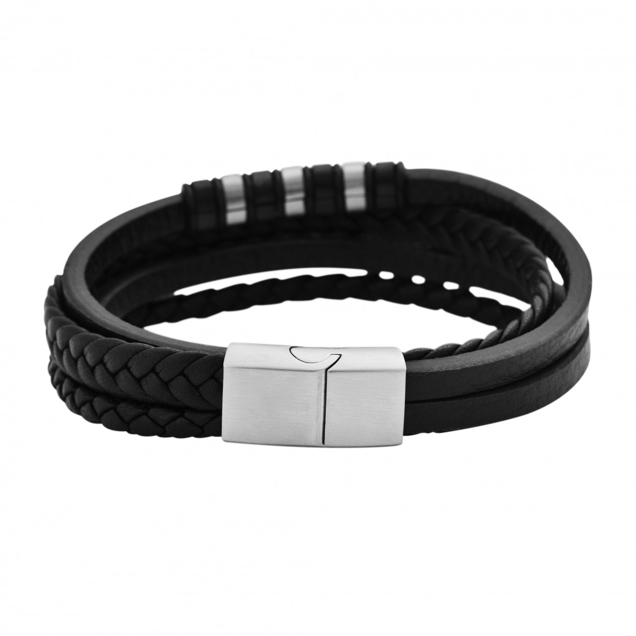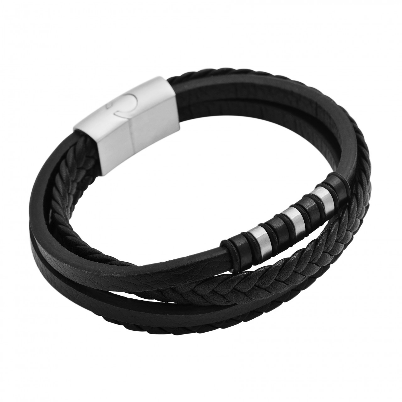 A pulseira de couro genuíno da marca Praktik possui quatro fileiras e está disponível em diversas cores. É composto por duas tiras de couro, uma tira trançada e um cordão de couro trançado. Além disso, a pulseira é decorada com pequenos elementos de aço inoxidável no meio. O prático fecho magnético também é feito de aço inoxidável e tem acabamento mate. O fecho também oferece área suficiente para receber pequenas gravuras. A moderna pulseira de couro genuíno tem 20,5 cm de comprimento e é uma ótima companheira do dia a dia que pode ser combinada de várias maneiras.