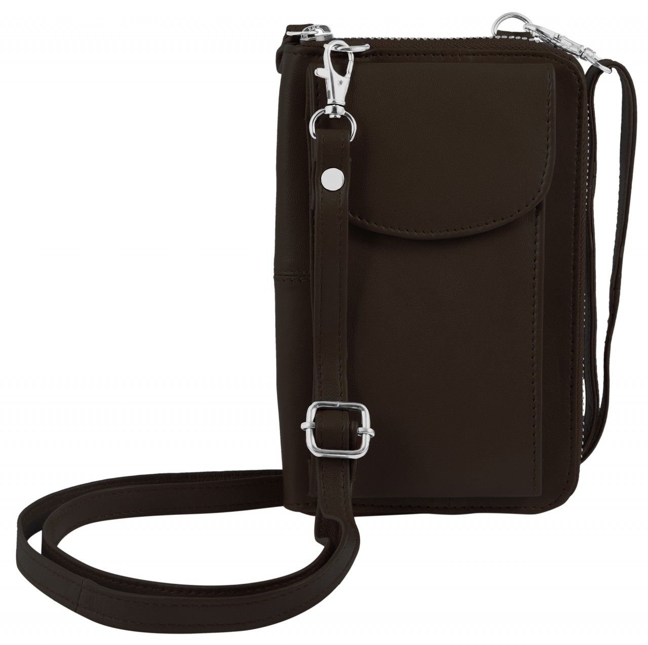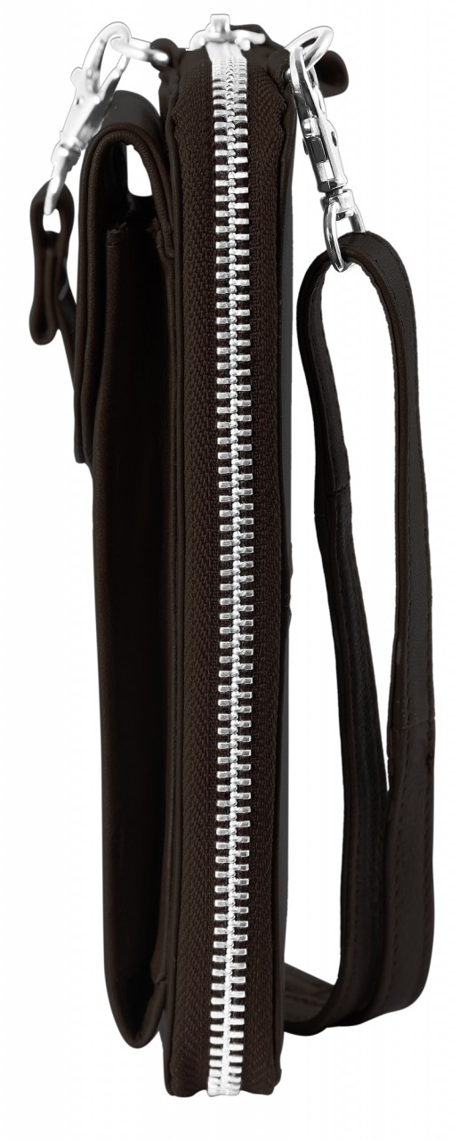 A bolsa de ombro para celular com carteira da marca Praktik é confeccionada em couro genuíno. É ideal para muitas atividades de lazer e pode substituir o incômodo de carregar uma bolsa grande. Oferece espaço de armazenamento suficiente para armazenar tudo o que é importante com clareza e também é adequado para celulares grandes como o iPhone 15. Possui 6 compartimentos para cartões de crédito, 2 compartimentos para notas e 1 compartimento com zíper para pequenos trocos. A carteira pode ser aberta e fechada com zíper na área externa. O bolso do telemóvel pode ser facilmente aberto e fechado separadamente através de um botão.