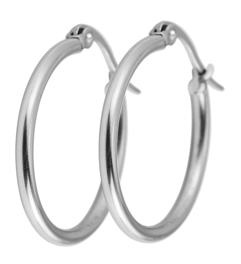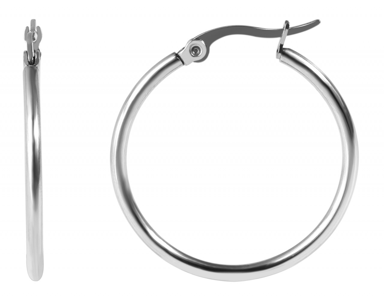 Os brincos de argola da marca Accent são feitos de aço inoxidável. O acabamento superficial é altamente polido e de cor prateada. Os clássicos brincos de argola podem ser abertos e fechados com um prático fecho dobrável. As dimensões dos brincos de argola consistem em largura de 2 mm, espessura de 2 mm e diâmetro que varia dependendo do modelo. Os brincos de argola estão disponíveis com diâmetro de 20 mm e 25 mm.