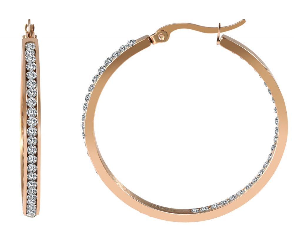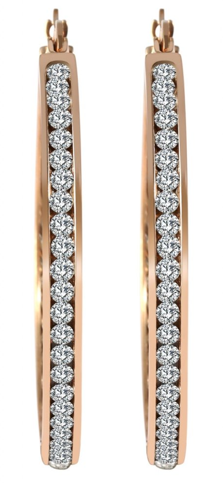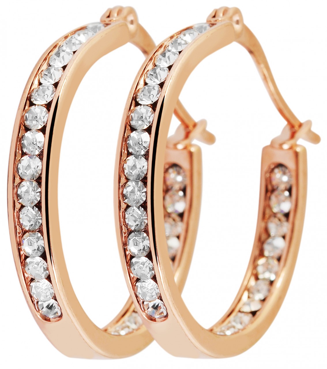 Os brincos de argola em ouro rosa da marca Praktik são feitos de aço inoxidável e decorados com pedras simil brilhantes por dentro e por fora. O acabamento da superfície polida adiciona brilho extra. O material é refinado com revestimento iônico de alta qualidade e prova ser particularmente robusto, durável e agradável à pele. O fecho é um prático fecho articulado em aço inoxidável que pode ser aberto e fechado com uma simples operação. Os brincos de argola estão disponíveis em diversos tamanhos, têm largura de 3,5 mm e espessura do material de 2,5 mm.
