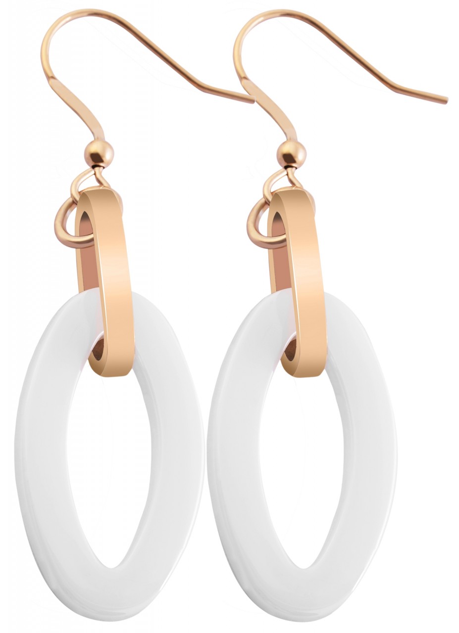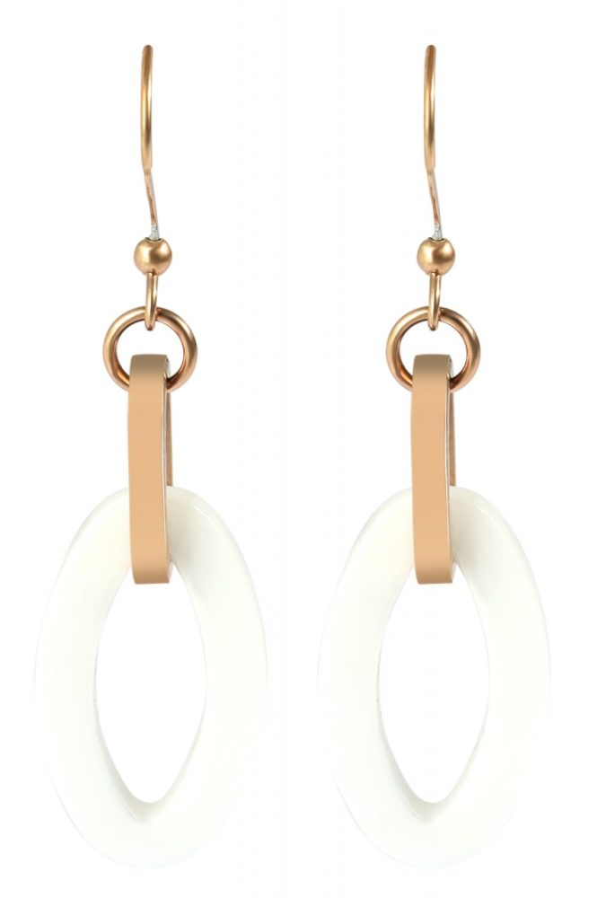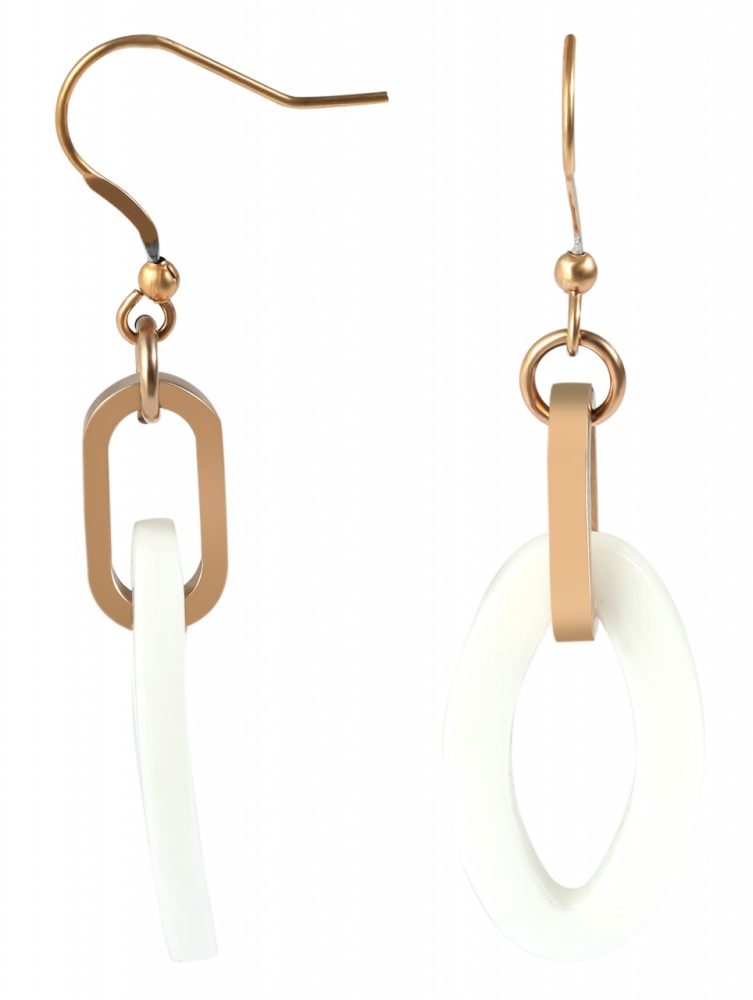 Brinco de realce em cerâmica e aço inoxidável. A cor é branca. A textura é mostrada em aço inoxidável brilhante. O item tem as seguintes dimensões: largura 8 mm, altura 4 cm.